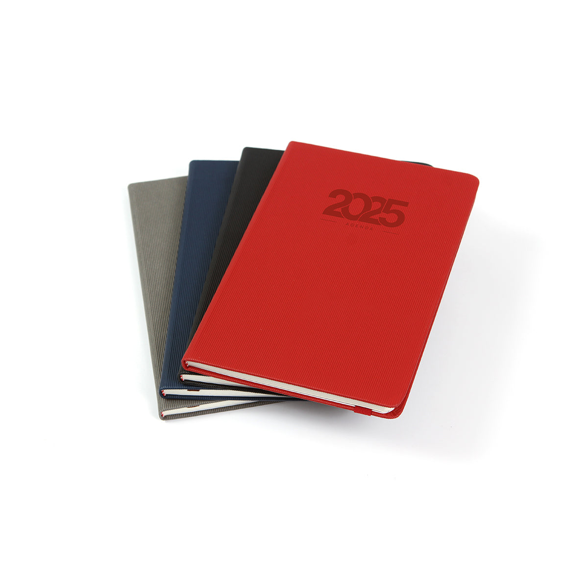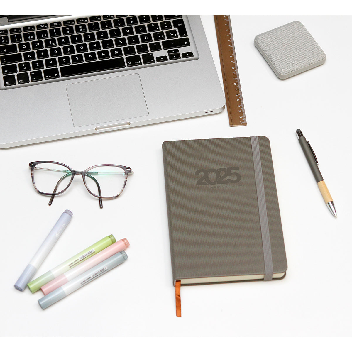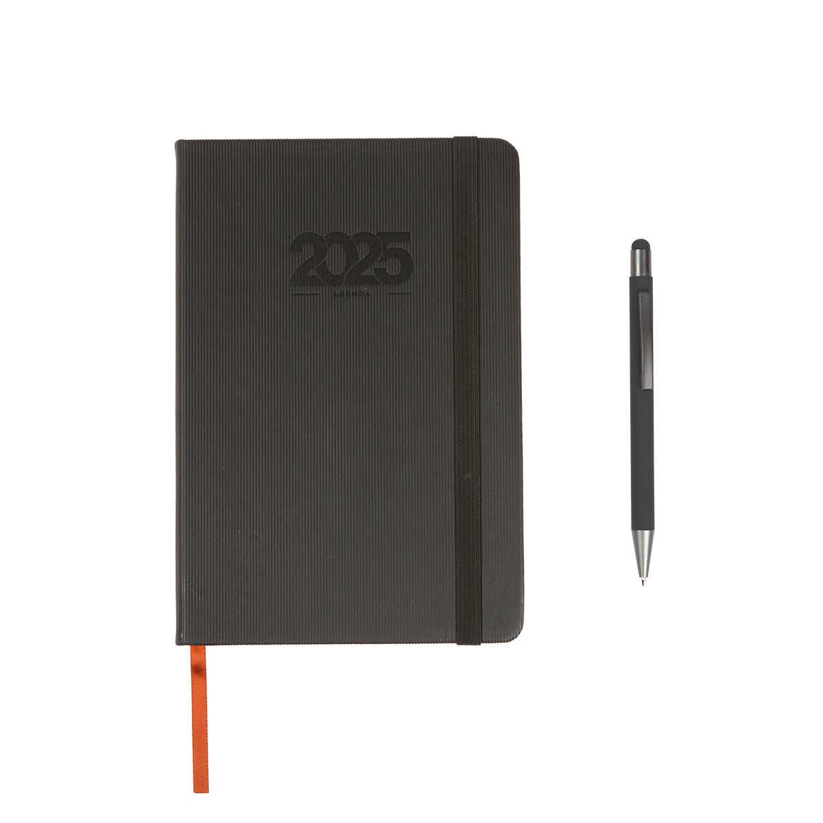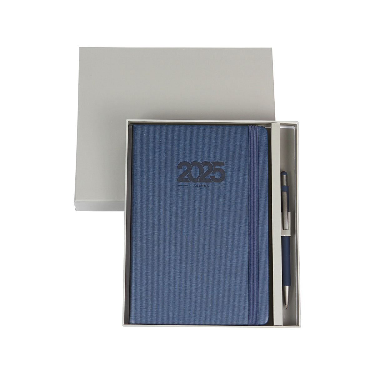 Set de Agenda diaria 2025 con pluma y caja de regalo. Cubierta fabricada en curpiel (PU) con resorte sujetador e interior de 175 hojas de 65 g. (350 paginas) Cada día tiene espacio para tareas importantes y está organizada por horario (5:00 am - 22:00 pm). Cuenta con: Separador de hojas, Calendario anual 2024-2026, planeador mensual, hoja de objetivos anuales, hoja de pendientes mensuales, espacio para notas, tareas, sección de contactos y bolsillo interno para almacenar documentos. Incluye caja de cartón individual y bolígrafo con tinta de escritura negra.