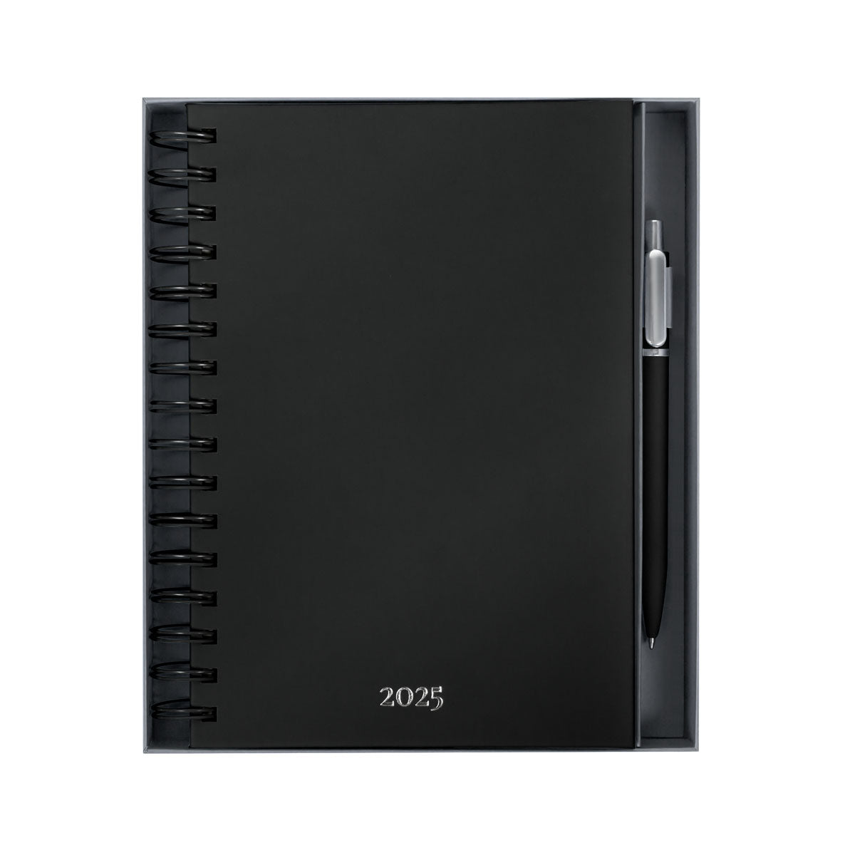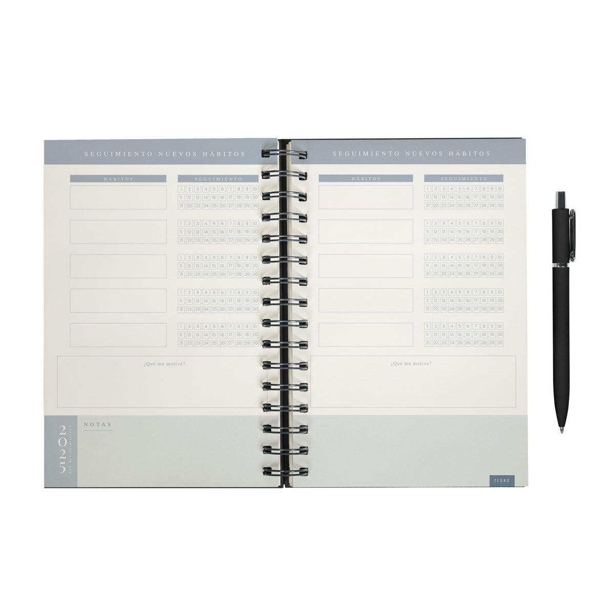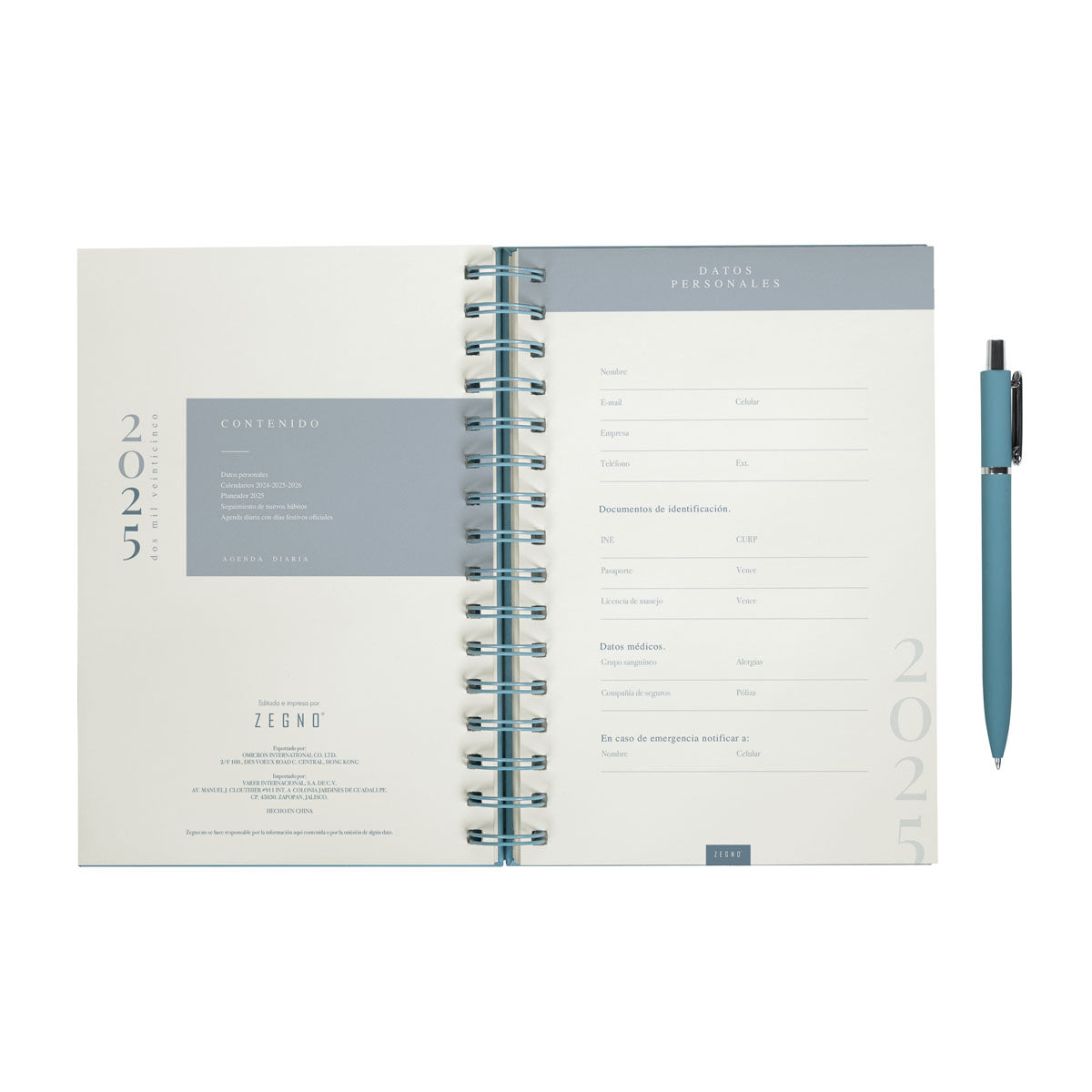 AGENDA DIARIA CON 174 HOJAS. CONTIENE DATOS PERSONALES, CALENDARIOS 2024-2025-2026, PLANEADOR 2025, SEGUIMIENTO DE NUEVOS HABITOS Y DIAS FESTIVOS. INCLUYE BOLIGRAFO METALICO Y CAJA INDIVIDUAL TIPO REGALO.