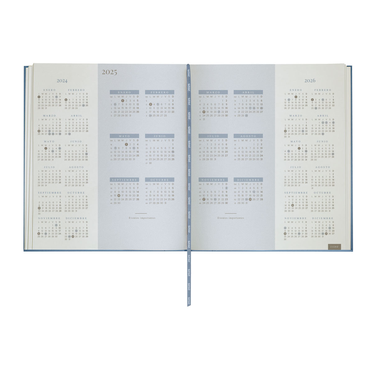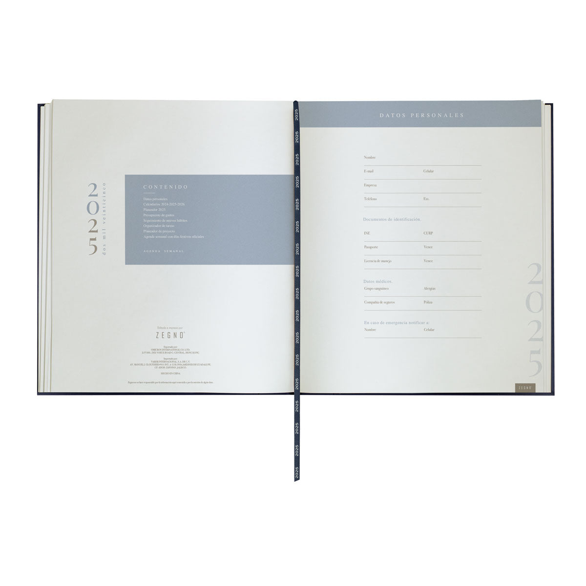 AGENDA SEMANAL CON 80 HOJAS. CONTIENE DATOS PERSONALES, CALENDARIOS 2024-2025-2026, PLANEADOR 2025, PRESUPUESTO DE GASTOS, SEGUIMIENTO DE NUEVOS HABITOS, ORGANIZADOR DE TAREAS, PLANEADOR DE PROYECTO Y DIAS FESTIVOS. INCLUYE CAJA INDIVIDUAL.