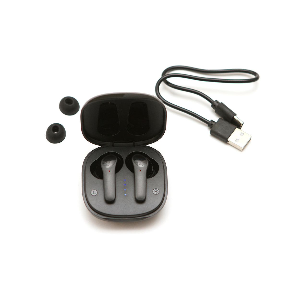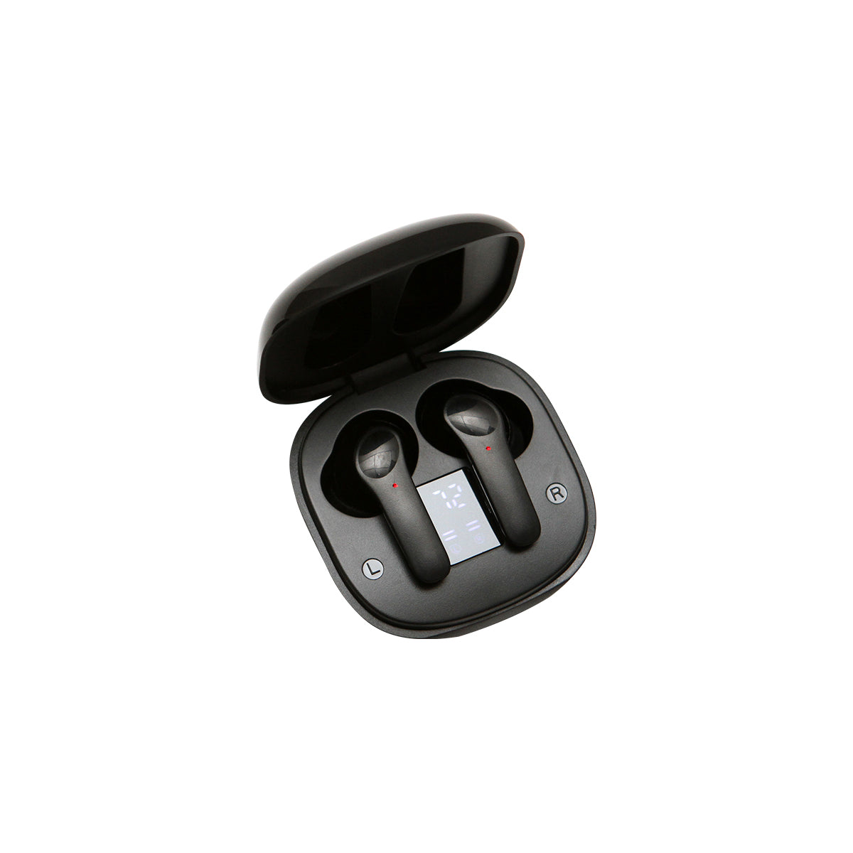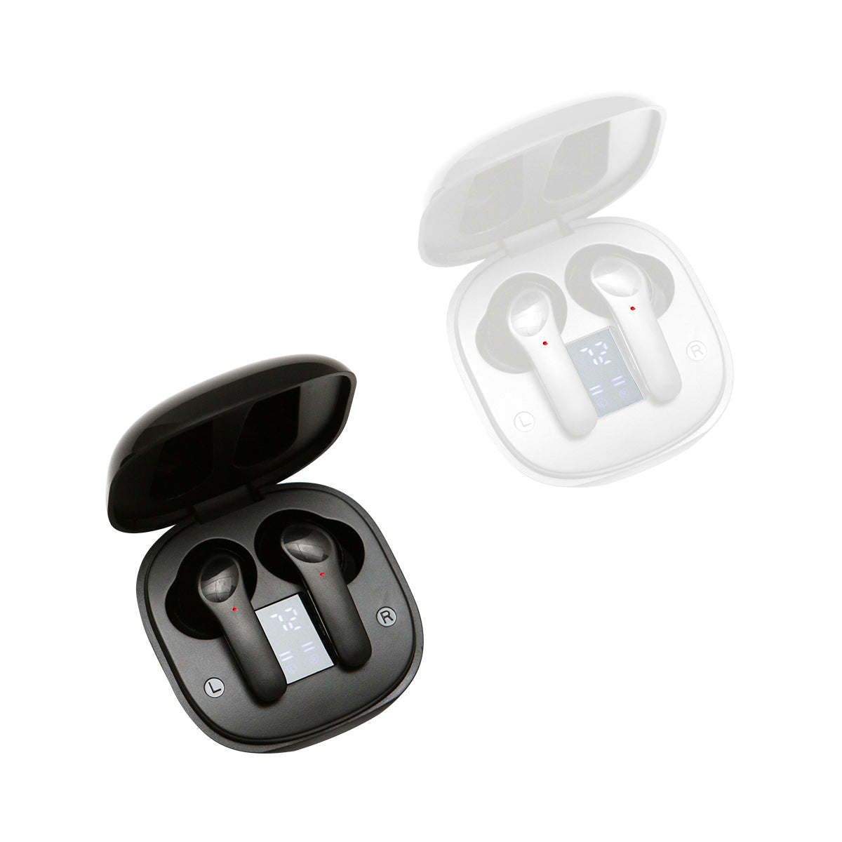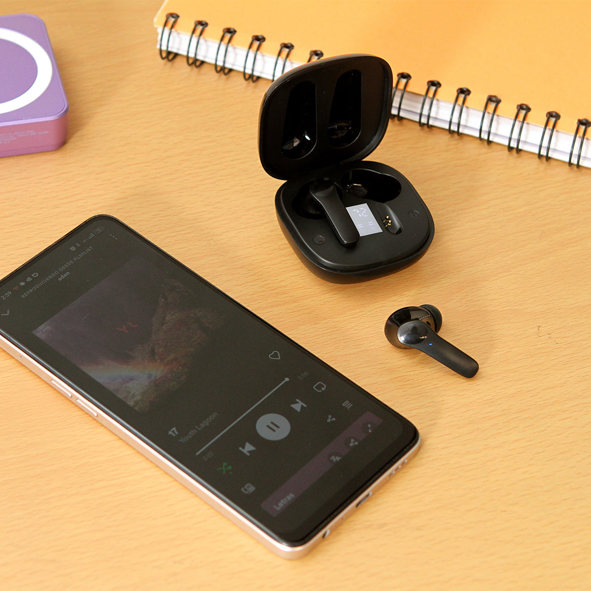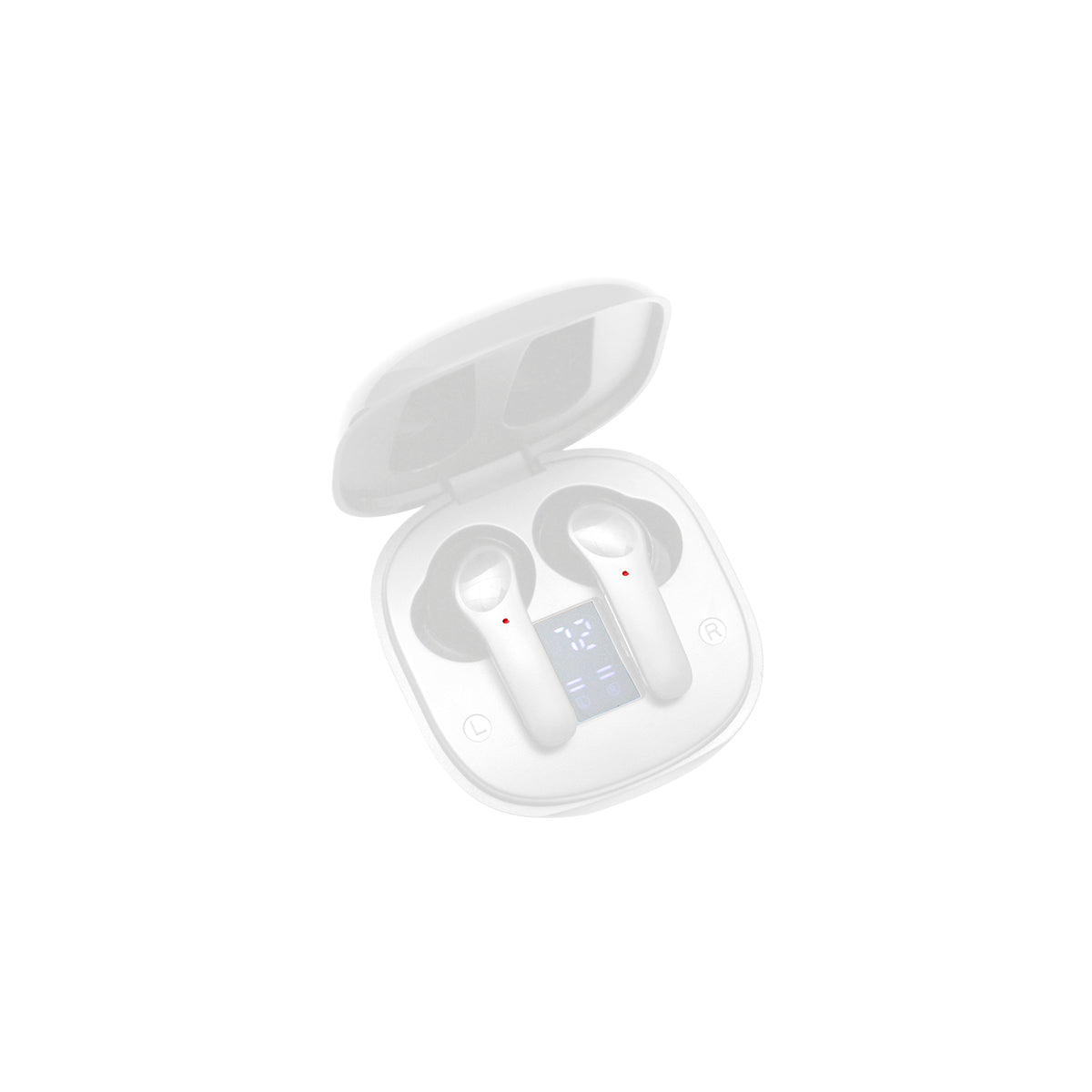 Audífonos con conexión de sonido sin cables, cuenta con pantalla para indicar nivel de carga, función touch y puerto de carga tipo C. Incluye estuche de carga.