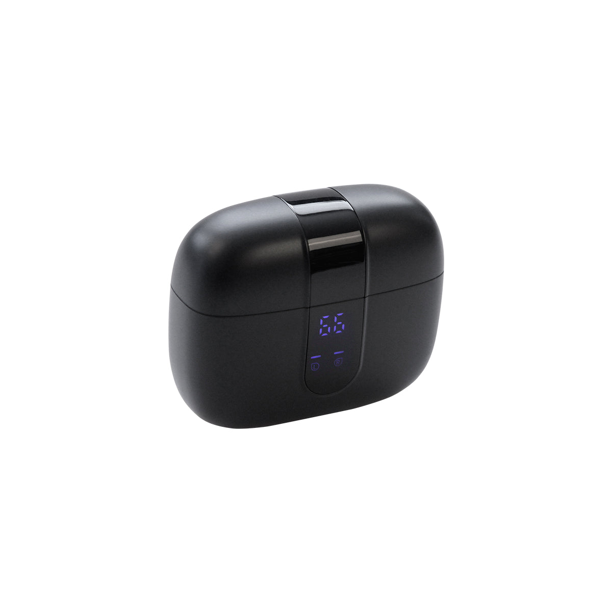 Audífonos con conexión de sonido sin cables a prueba de agua y función touch, fabricados en plástico ABS, con display en la parte frontal que muestra el nivel de batería. Incluye cable de carga USB y caja de cartón individual.