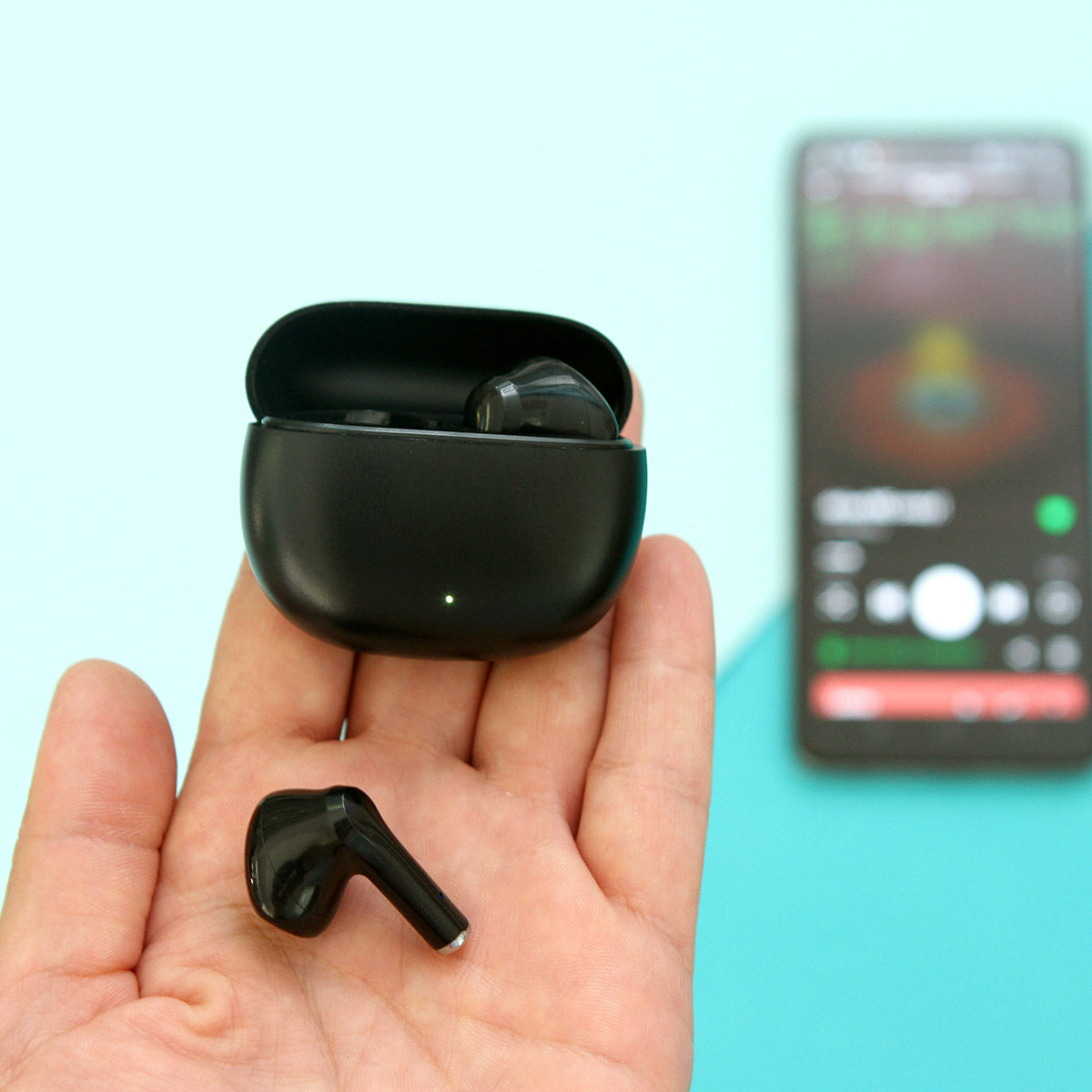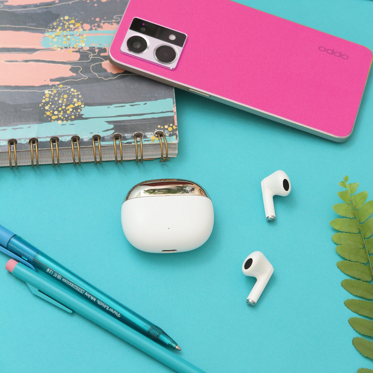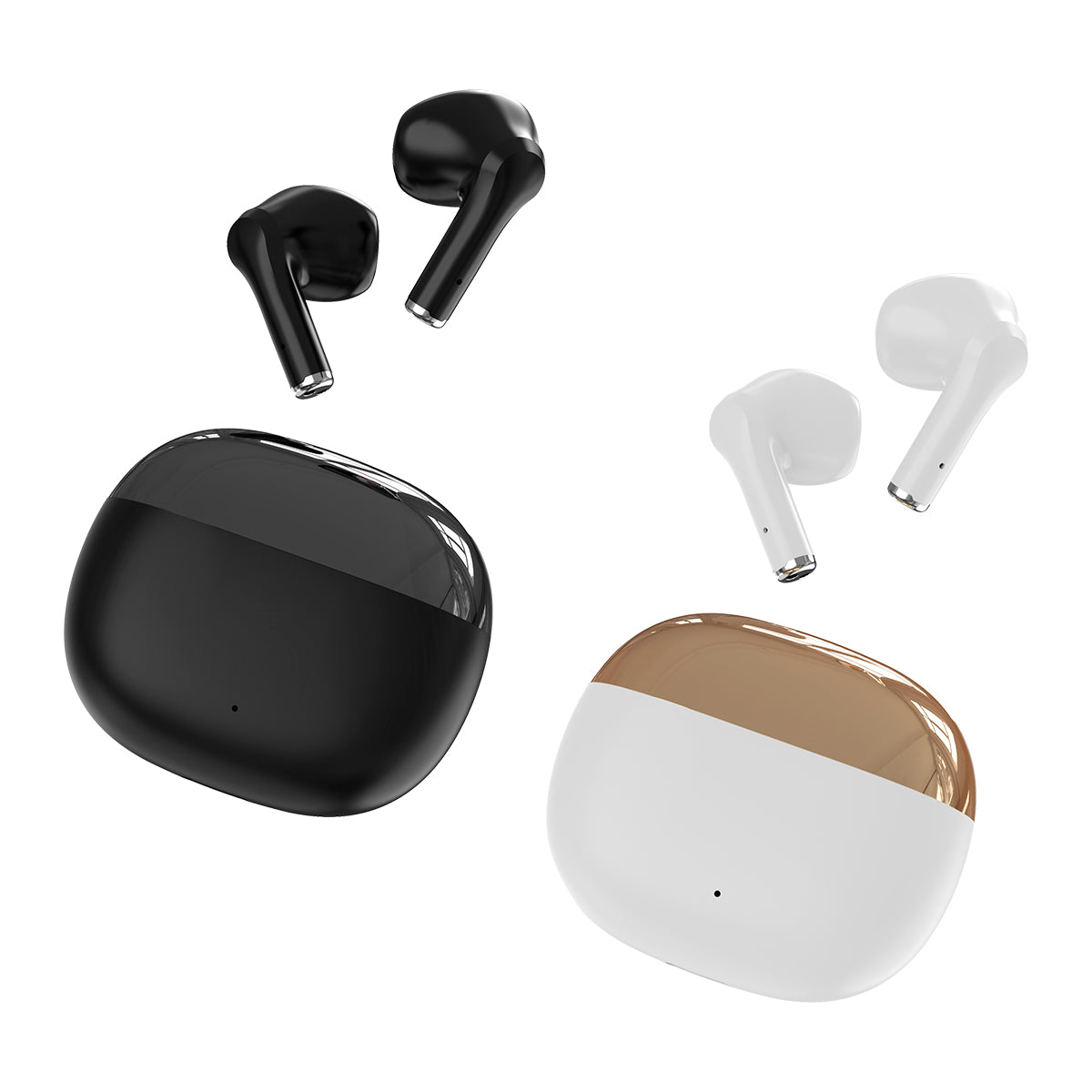 Audífonos con conexión de sonido sin cables bi-tono, en la parte superior con acabado brilloso, y parte inferior con acabado mate, con estuche de carga ovalado, los audífonos tienen un ligero detalle en color plateado en la parte inferior.  Incluye cable de carga USB y caja de cartón individual.