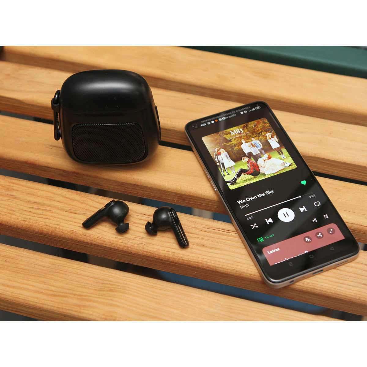 Bocina con audífonos con conexión de sonido sin cables, fabricada en plástico, incluye arnés para fácil transporte, carga a través de cable USB (incluido). Cuenta con audífonos inalámbricos que ofrecen una experiencia auditiva privada, perfecta para aquellos momentos en que deseas disfrutar de tu música sin molestar a los demás o para mantener conversaciones telefónicas más privadas. Incluye caja de cartón individual.