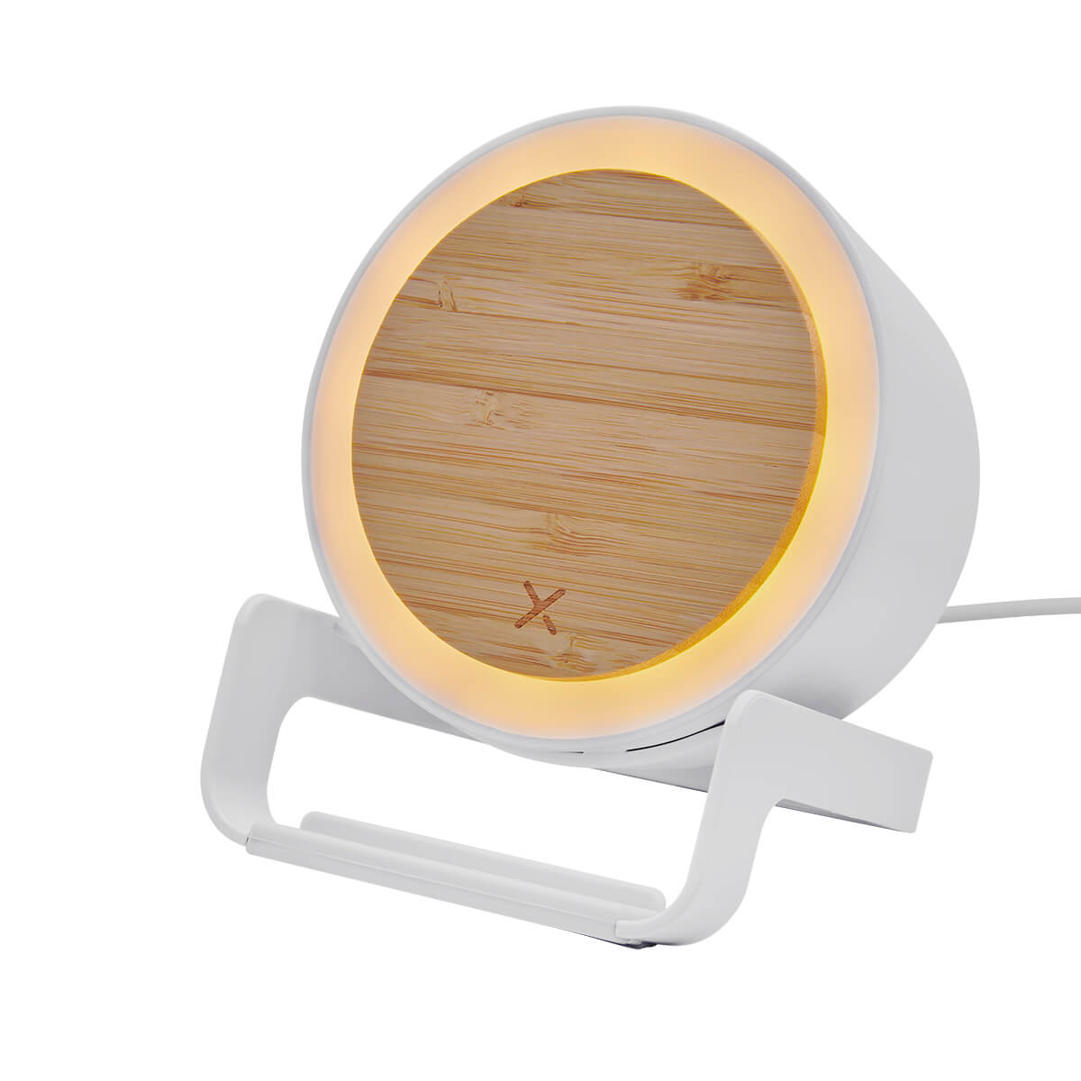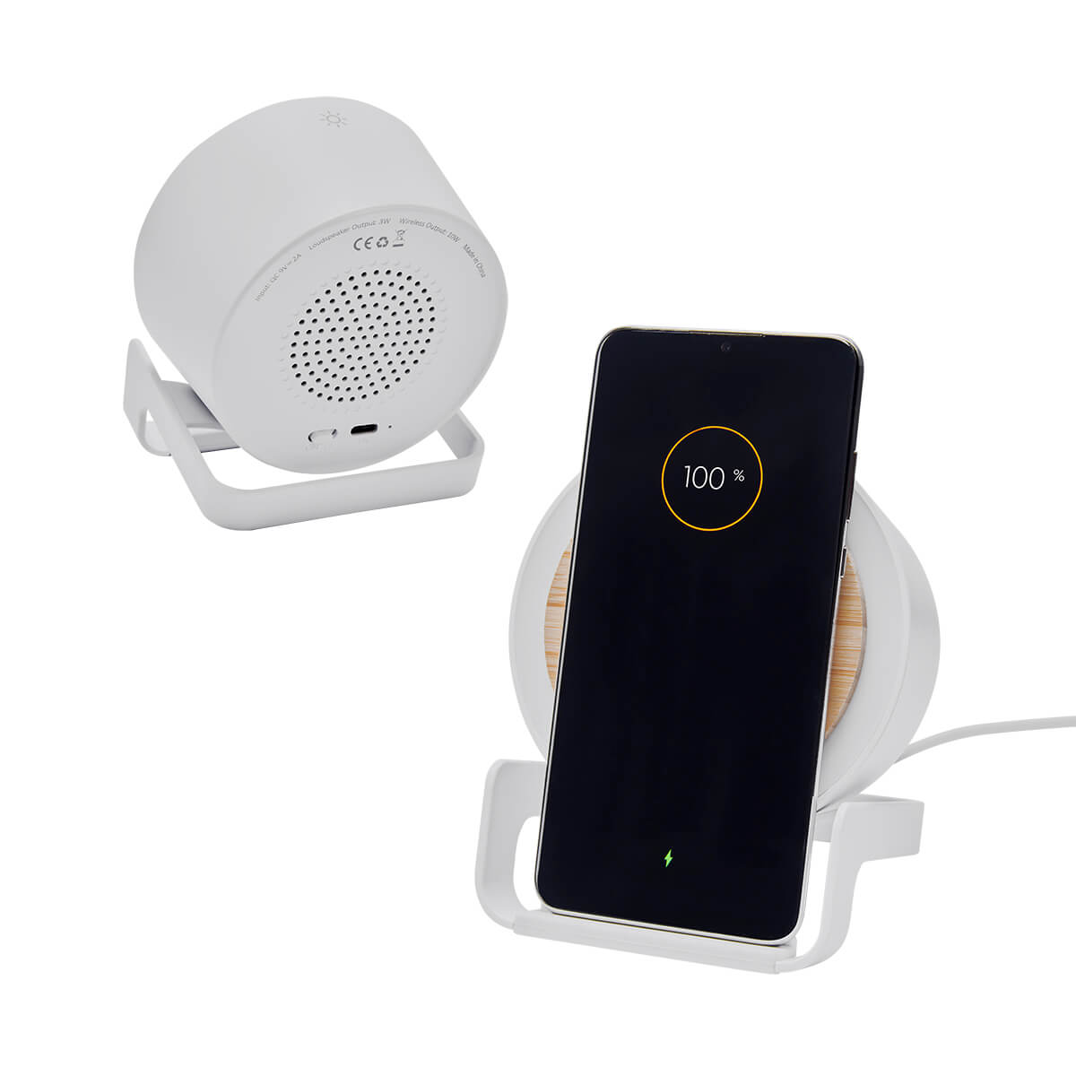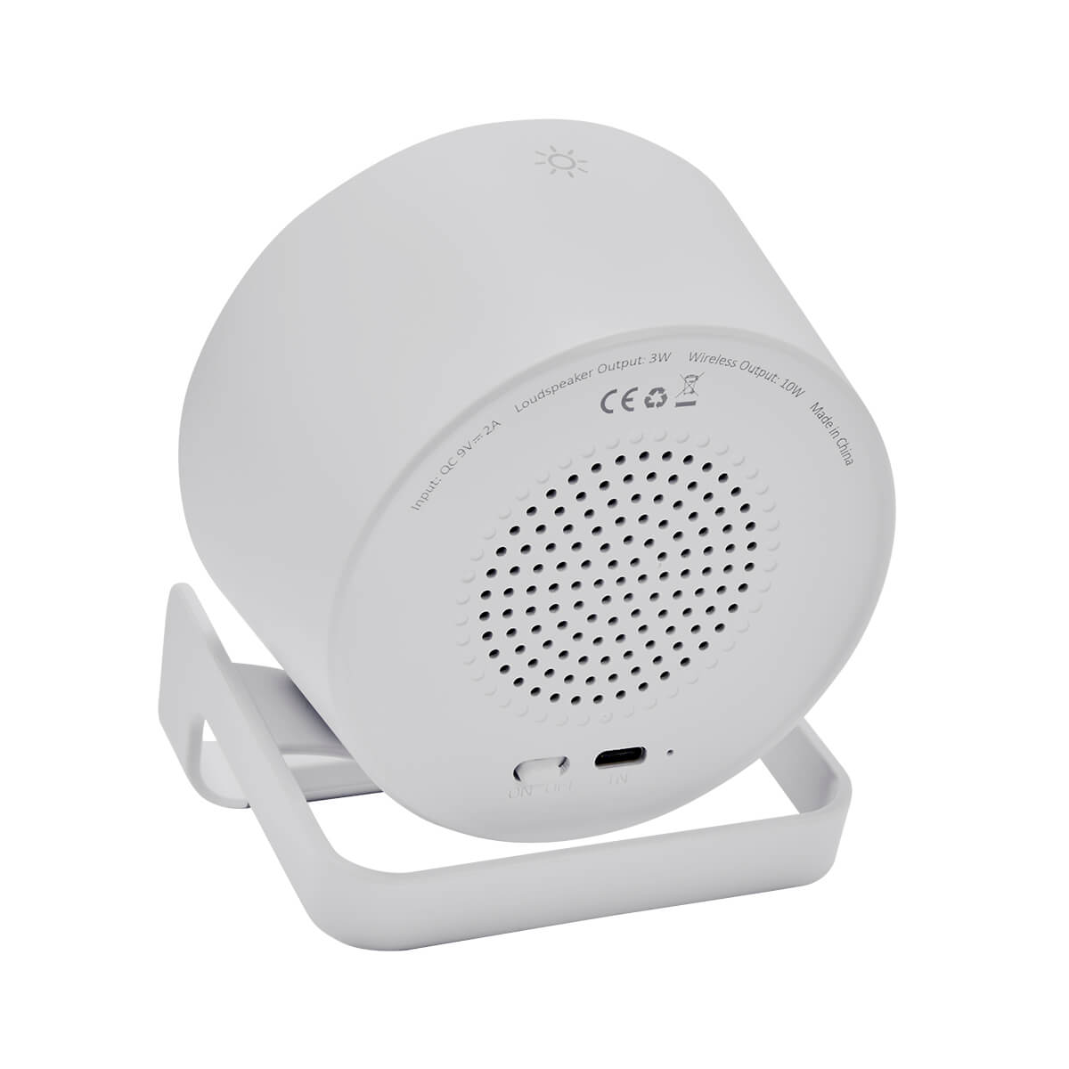 BOCINA BLUETOOTH CON CARGADOR INALAMBRICO DE 5W Y LUZ LED AJUSTABLE A 3 DIFERENTES INTENSIDADES. SOPORTE VERTICAL PARA TELEFONO CELULAR. INCLUYE CABLE CARGADOR USB.