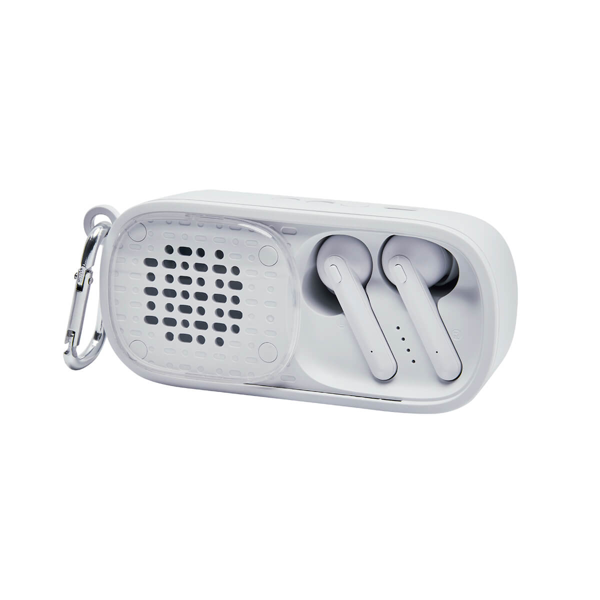BOCINA Y AUDIFONOS BLUETOOTH CON BATERIA RECARGABLE. REPRODUCCION DE MUSICA DE 3 HRS APROXIMADAMENTE. RANGO DE CONEXION DE 10 METROS. MOSQUETON PARA TRANSPORTAR FACILMENTE. INCLUYE CABLE CARGADOR USB.