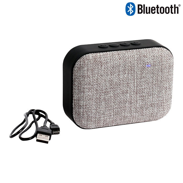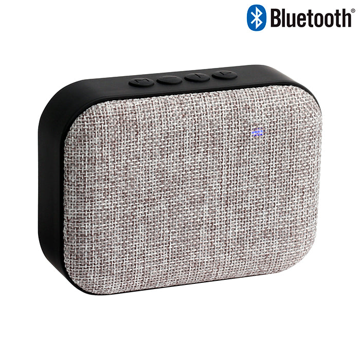 Bocina portátil con conexión de sonido sin cables,. Fabricada en plástico con recubrimiento de tela.