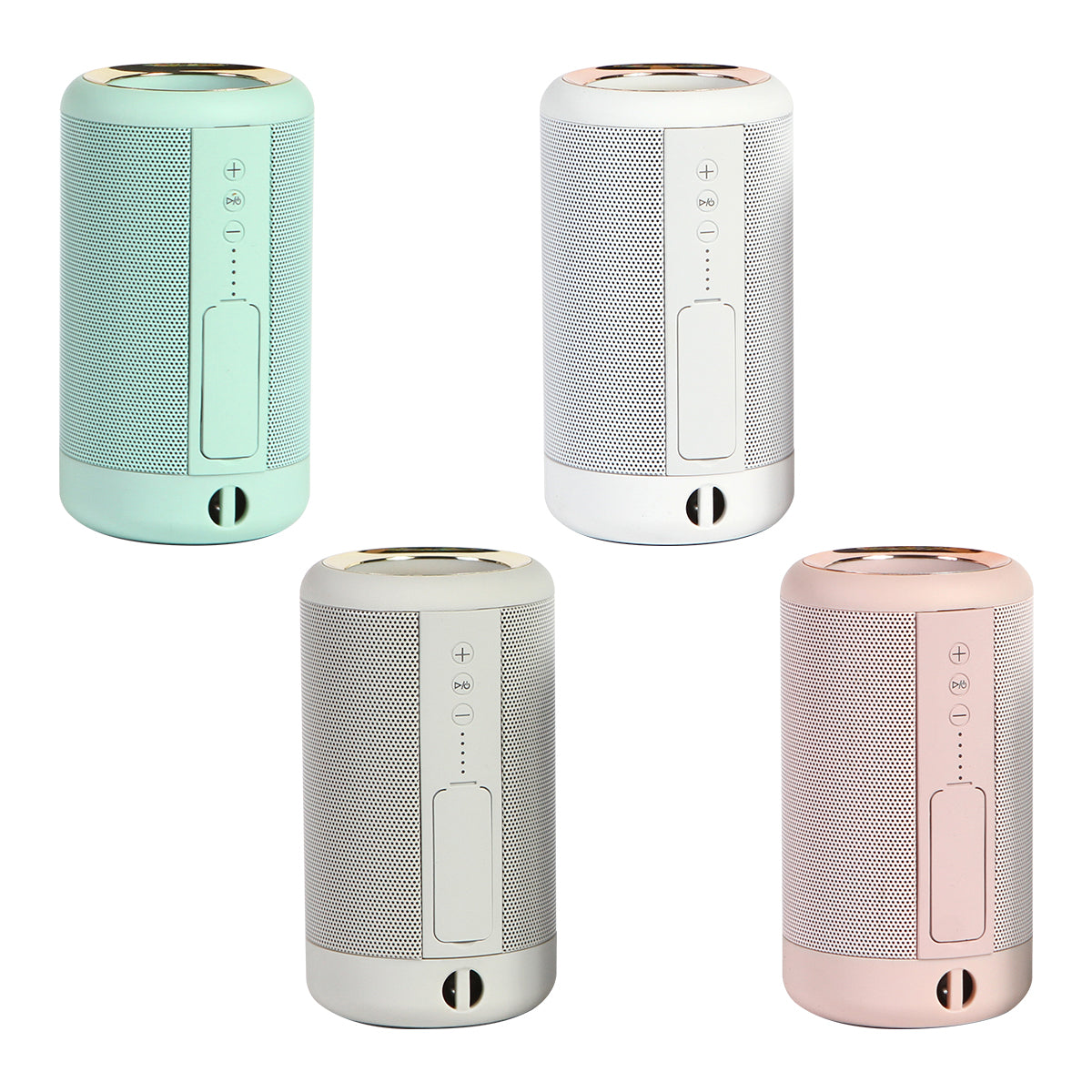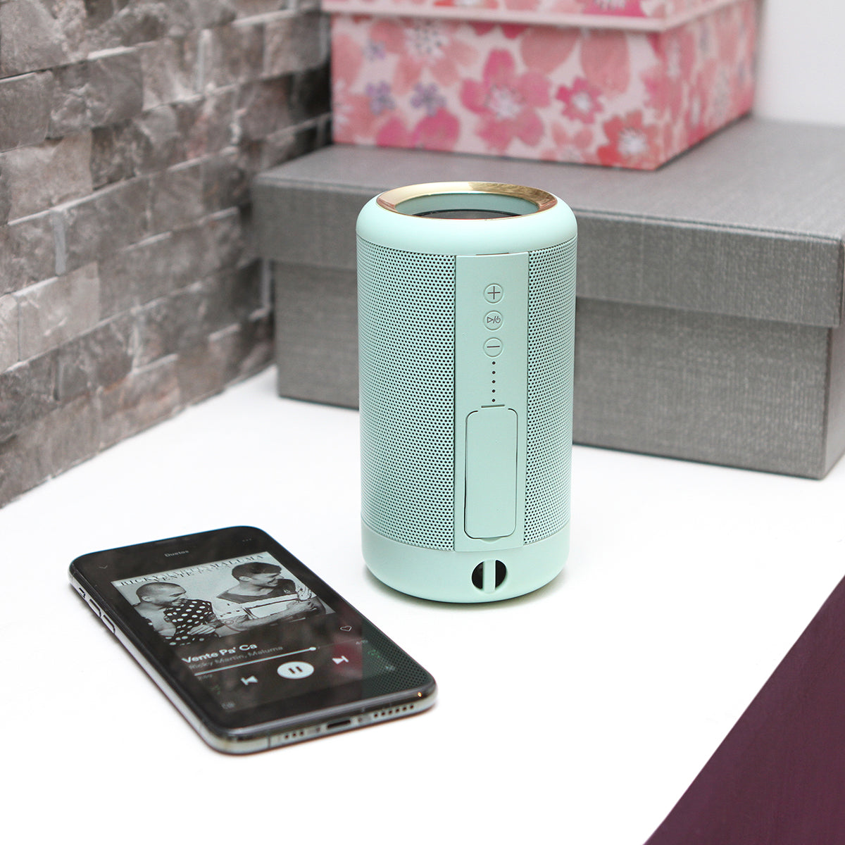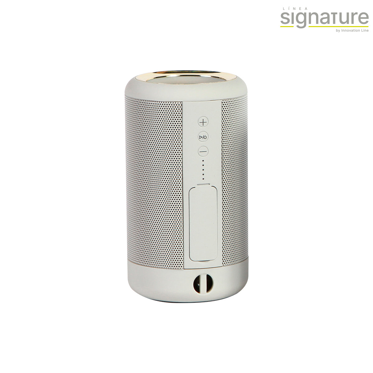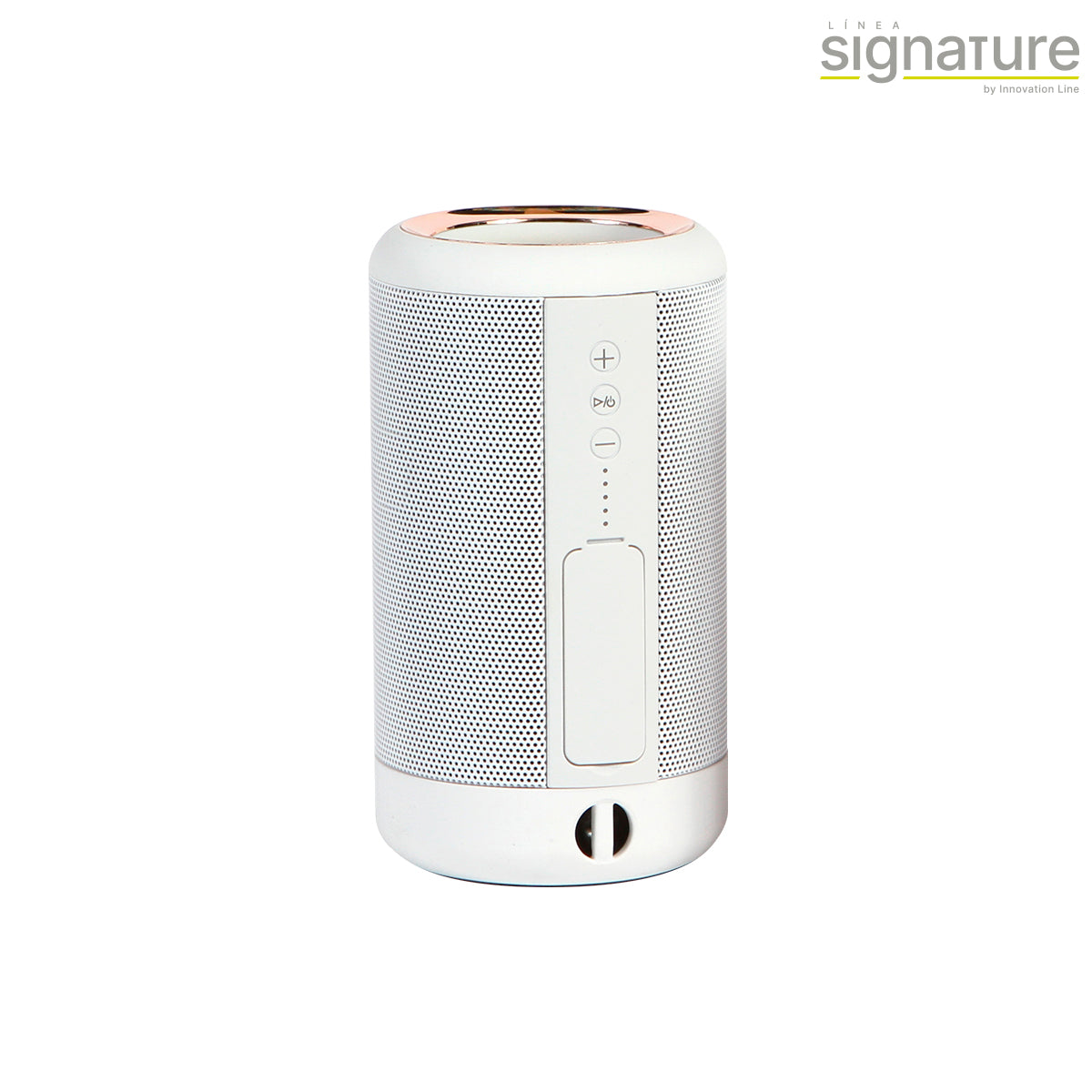 Bocina con conexión de sonido sin cables,  power bank con capacidad de 1,200 mAh, batería integrada de iones de litio, fabricada en plástico ABS con acabado rubber (suave), con un detalle color dorado en la parte superior, con entrada protegida.