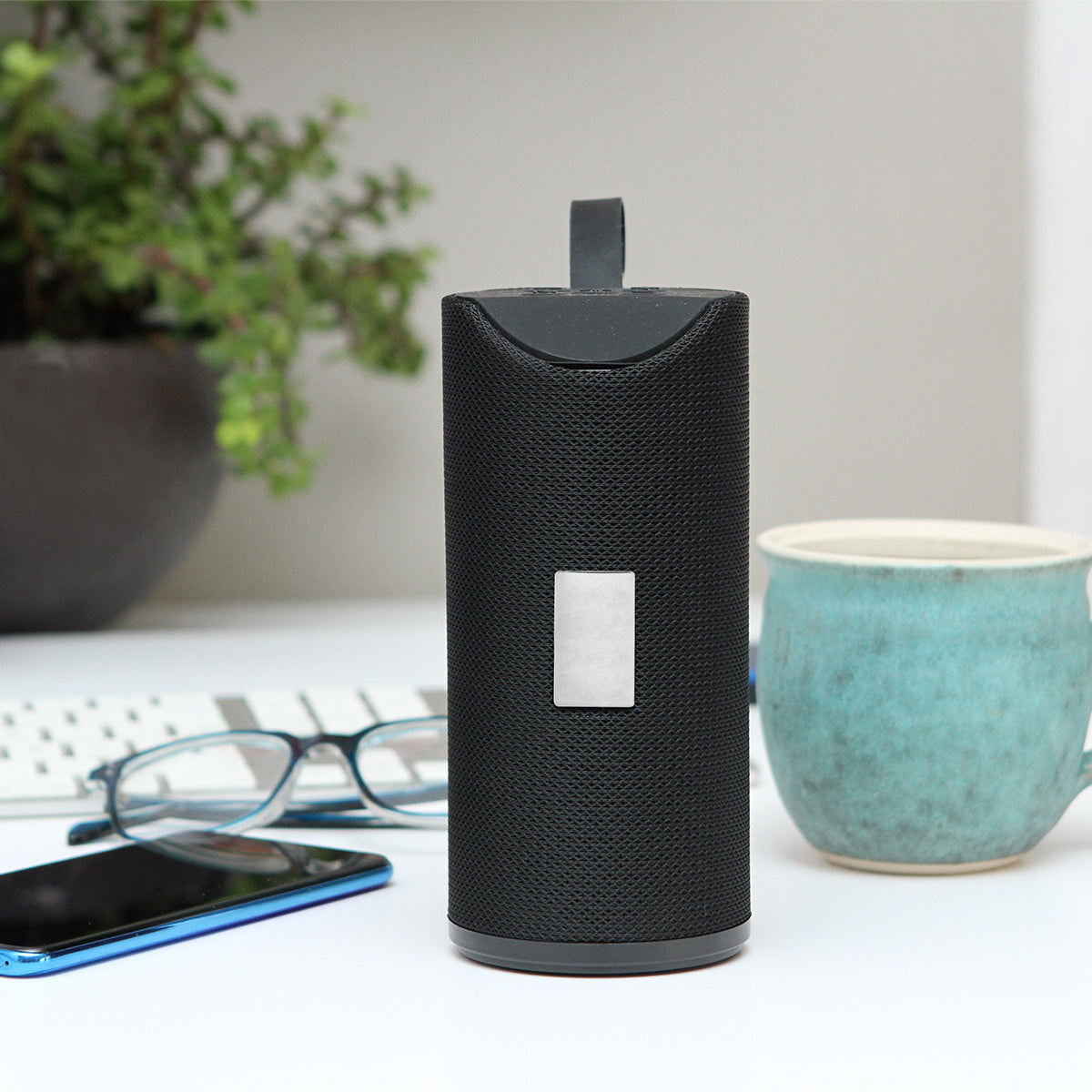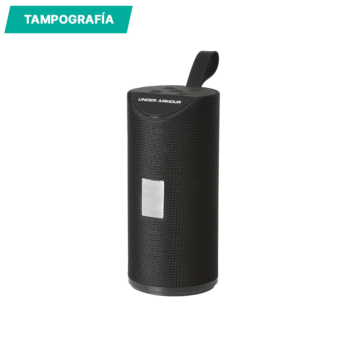 Bocina con conexión de sonido sin cables, asa en la parte superior, con una placa en la parte frontal para grabar, botones en la parte superior, carga a través de cable USB (incluido), cable auxiliar para audio y caja individual de cartón.