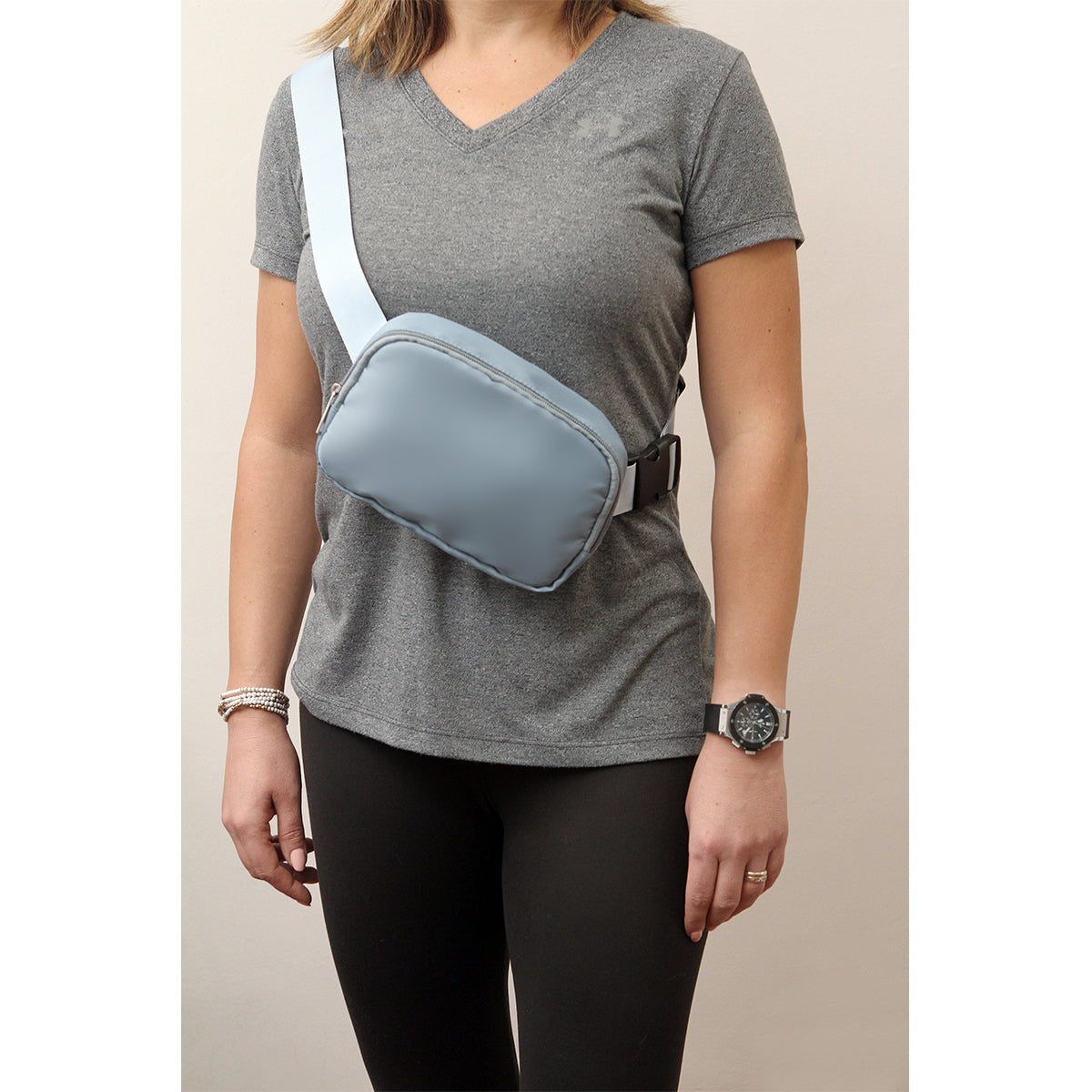 Bolsa deportiva multifunciones fabricada en poliester. Puede utilizarse como cangurera o pechera. Cuenta con una correa convertible y ajustable que te permite  elegir si llevarla sobre la cintura o sobre el hombro. Tiene tres compartimientos internos ideales para guardar artículos pequeños como audífonos, celular, monedas, lentes, etc.