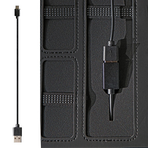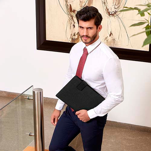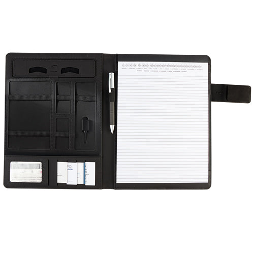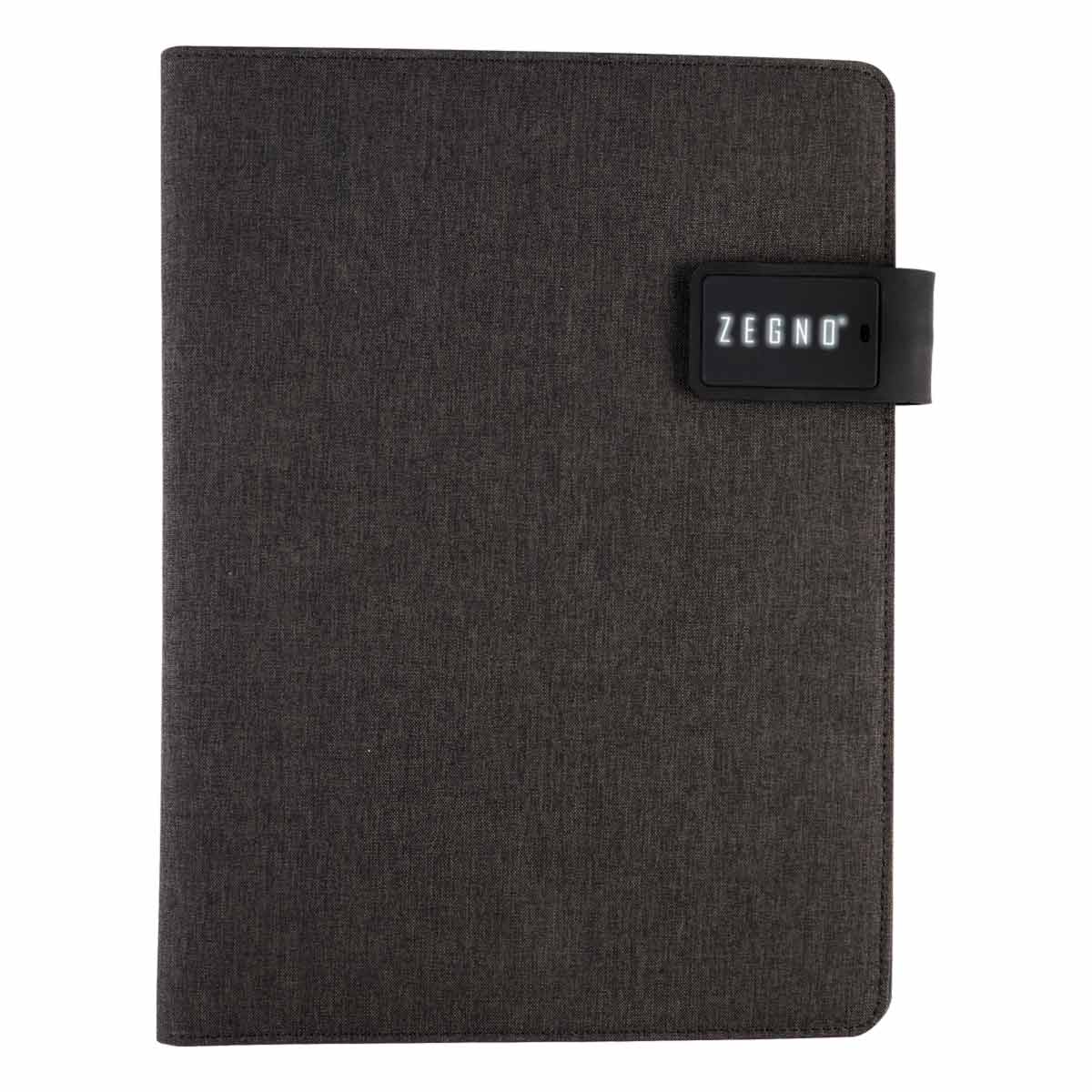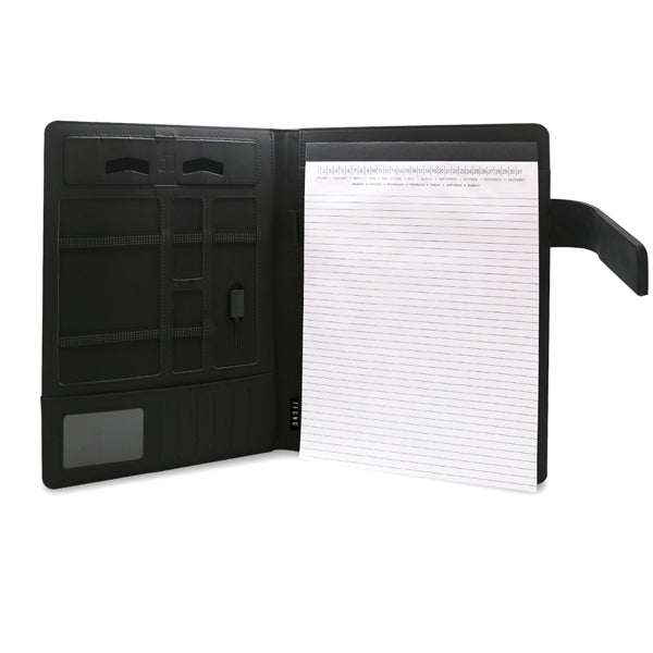 INCLUYE BLOCK DE RAYA TAMAÑO A4 CON 20 HOJAS, ELÁSTICO PARA BOLÍGRAFO, COMPARTIMENTO PARA SMARTPHONE, TABLET Y TARJETAS. BATERÍA AUXILIAR PARA SMARTPHONE CON CAPACIDAD 4,000 MAH. BROCHE MAGNÉTICO CON LUZ QUE AL GRABAR EL LOGO SE ILUMINA. BOLÍGRAFO NO INCLUIDO.
