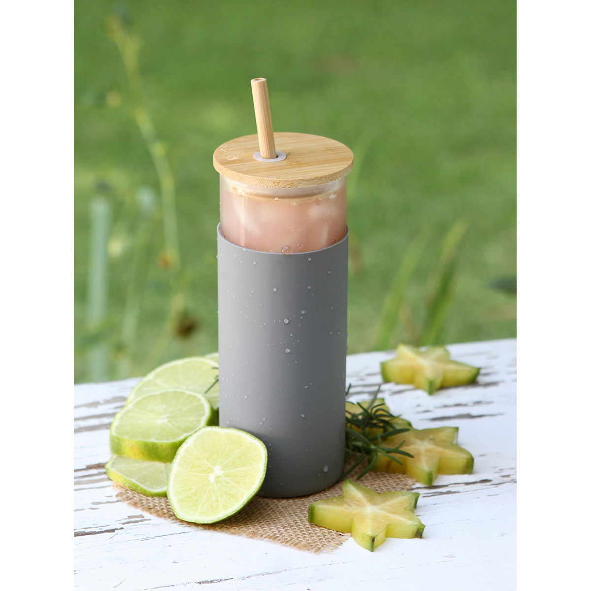 Cilindro de vidrio de borosilicato con manga de silicón, tapa de bambú con anillo de silicón y popote de bambú. Capacidad de 450 ml (15 oz). Incluye caja de cartón individual.