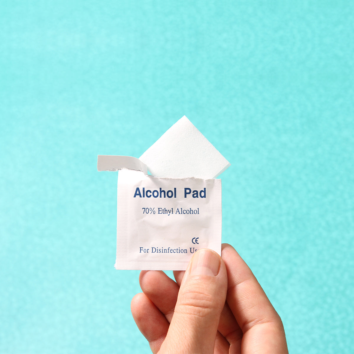 Contenedor fabricado en plástico ABS, correa de silicón y detalle tipo ventana abierta en una de sus caras, con 10 pads de non woven con alcohol al 70%.