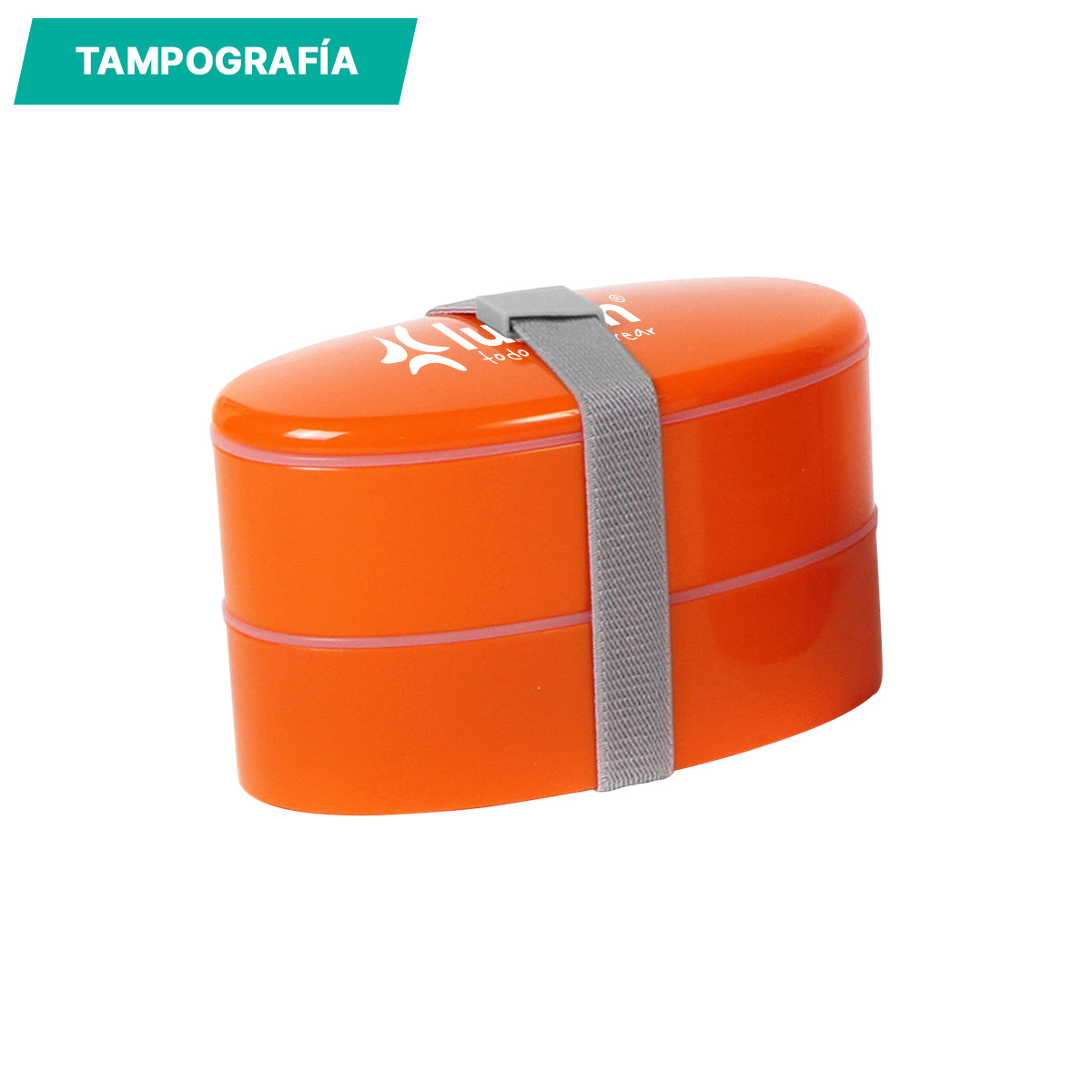 Contenedor de alimentos con dos compartimentos separados, tapa hermética y banda elástica sujetadora de tapa. Viene con cubiertos incluidos (cuchara, tenedor y cuchillo) apto para el uso en el microondas.