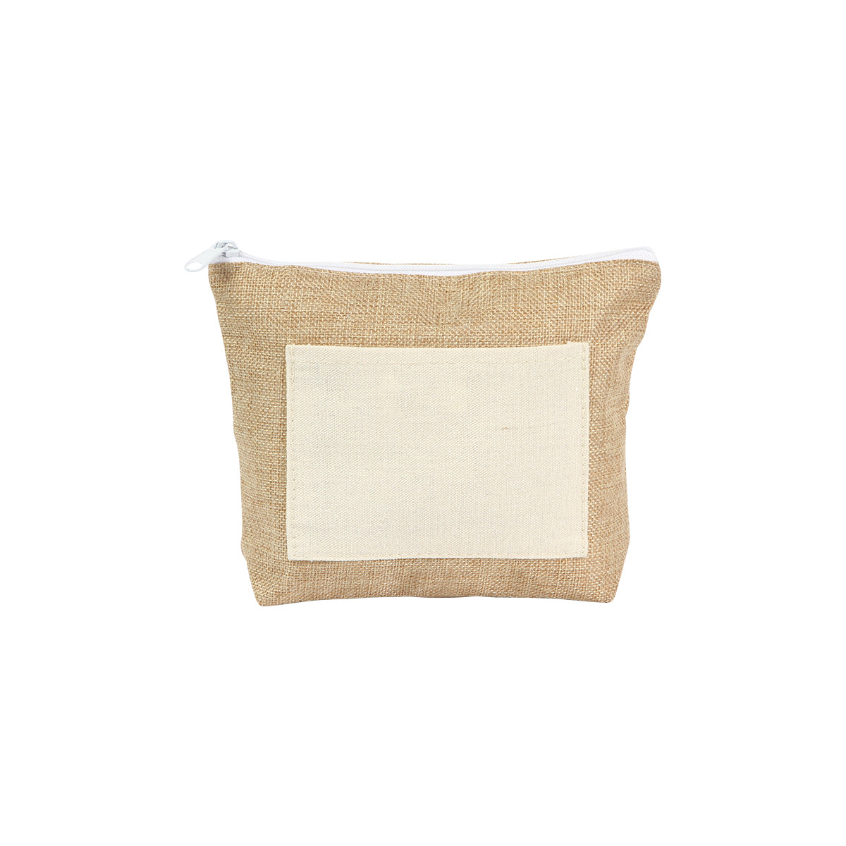 Bolsa cosmetiquera fabricada en algodón 10A y yute imitación (poliéster). Cuenta con cierre metálico y detalle de diseño cuadrado.