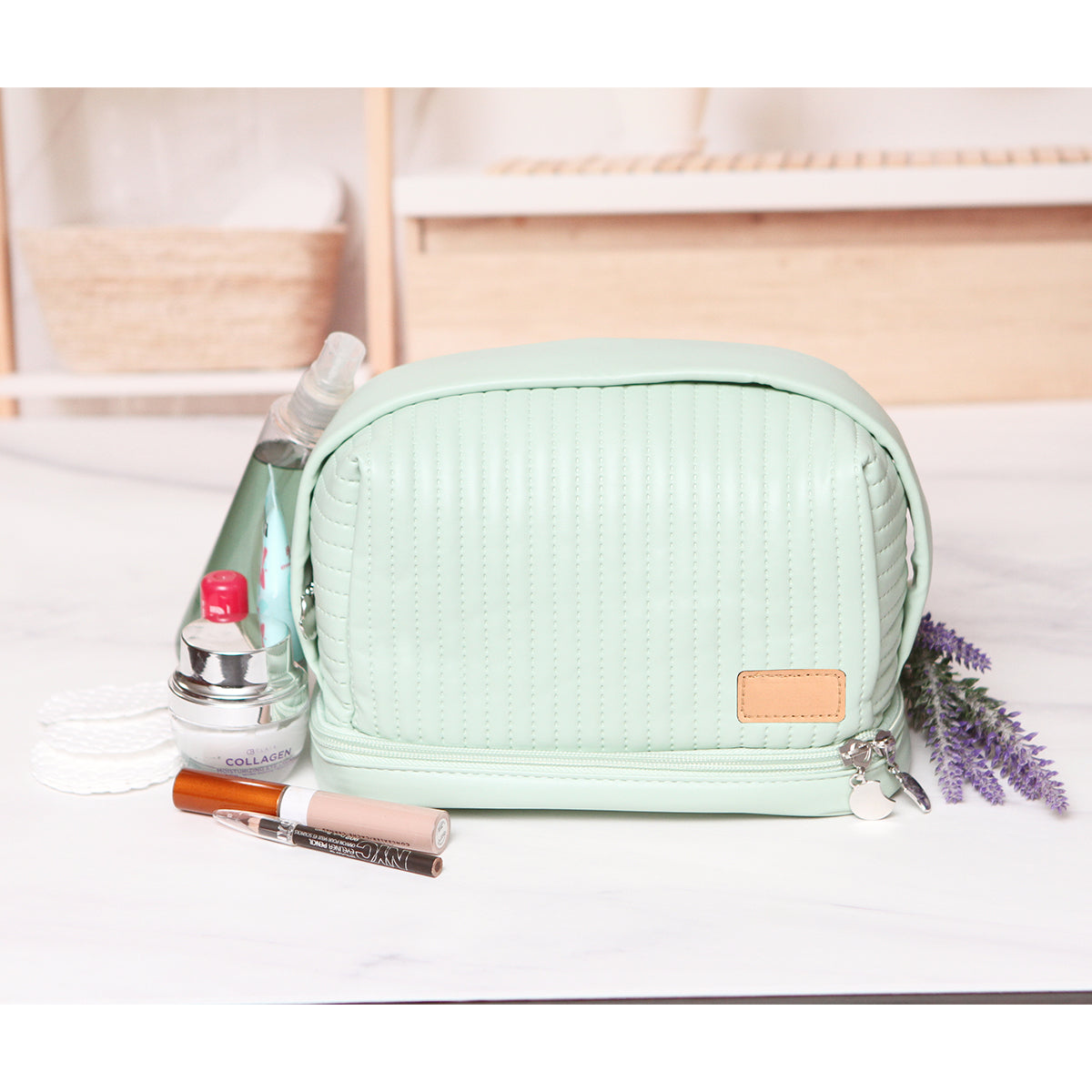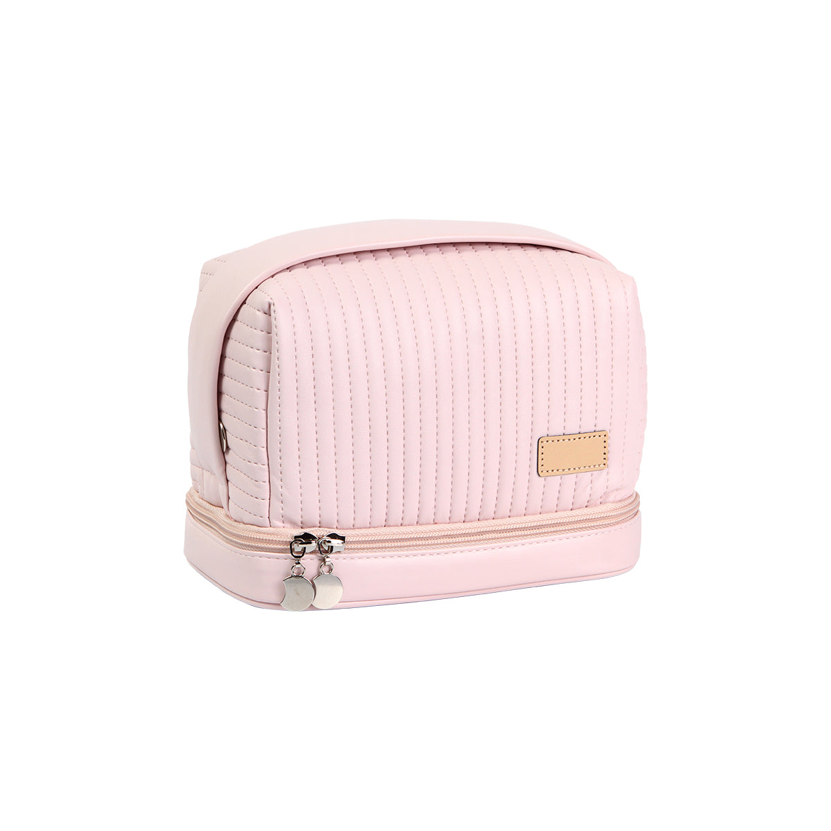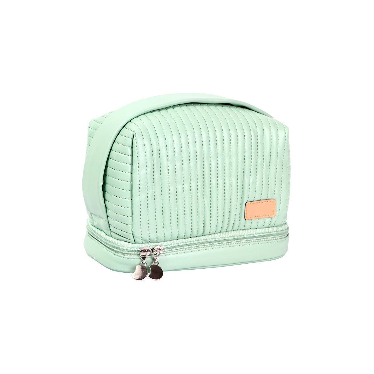 Bolsa de cosméticos fabricada en curpiel y poliéster. Con tacto crema y asa, dos bolsillos con cremallera, uno impermeable con forro de acetato de vinilo y polietileno (PEVA). Diseño semicircular con rayas.
