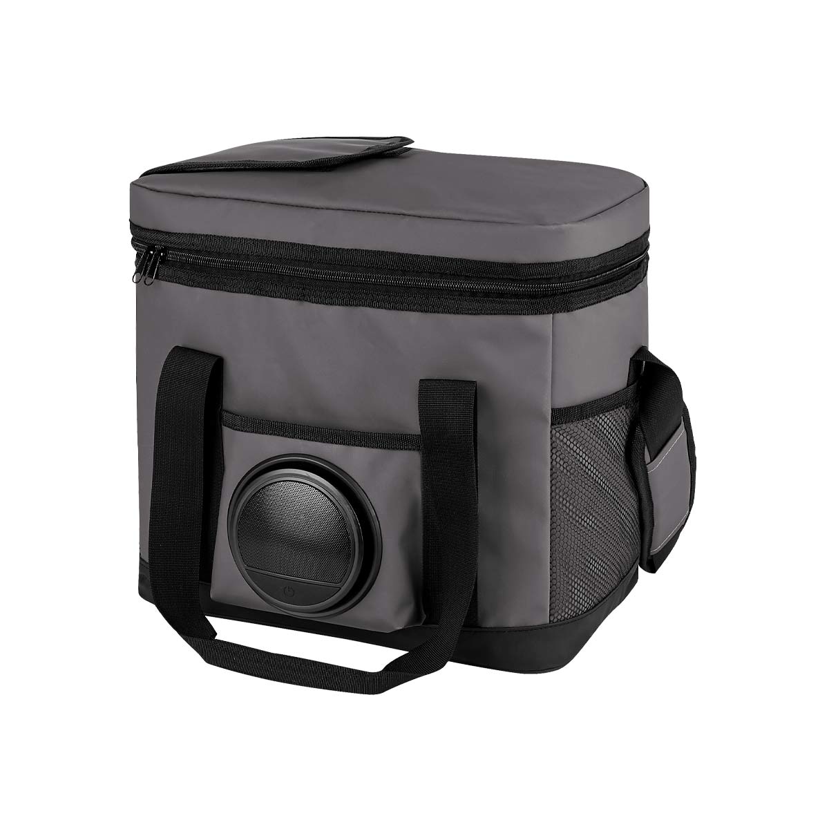 HIELERA CON BOCINA BLUETOOTH DESPRENDIBLE CON BATERIA RECARGABLE DE 2 HORAS DE REPRODUCCION DE MUSICA APROXIMADAMENTE. INTERIOR PLASTIFICADO IMPERMEABLE. CUBIERTA CON VENTANA PARA FACIL ACCESO AL INTERIOR. INCLUYE BOLSA FRONTAL PARA BOCINA, 2 BOLSAS LATERALES DE RED, ASAS Y CORREA AJUSTABLE. CAPACIDAD PARA 24 LATAS.