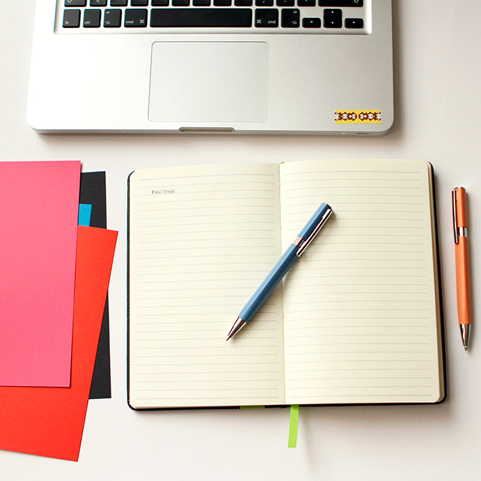 Libreta pasta rígida fabricada en poliuretano con resorte, porta pluma y detalles en color, con 80 hojas de raya. No incluye pluma. Tamaño A5.