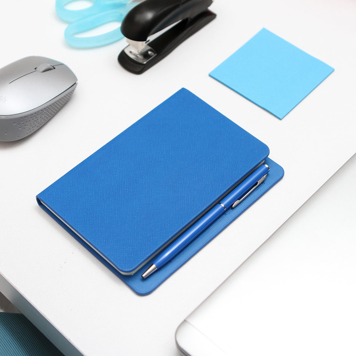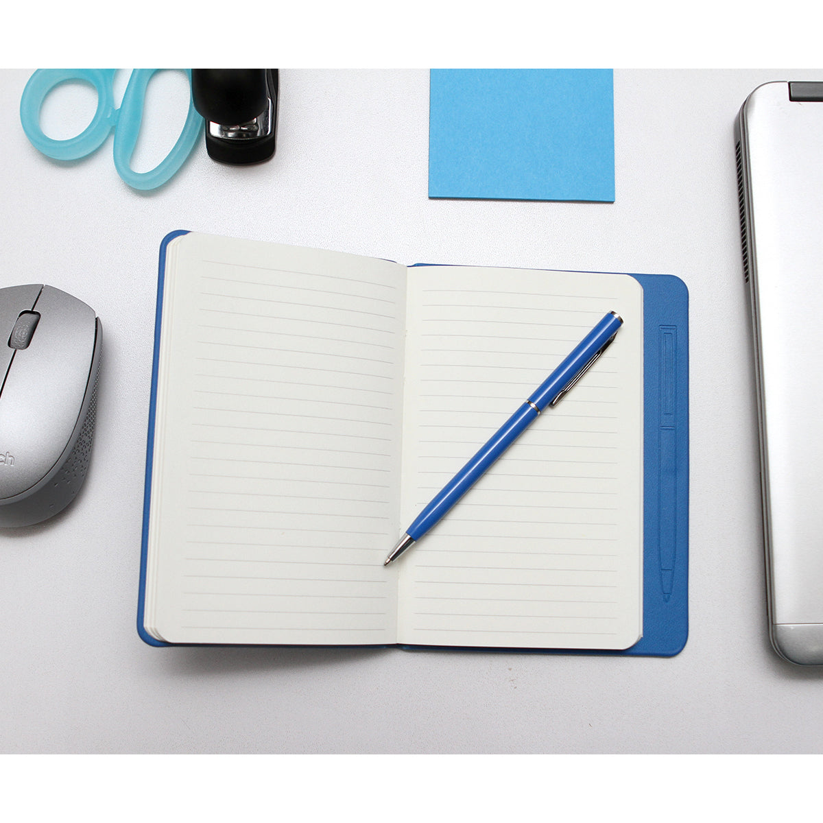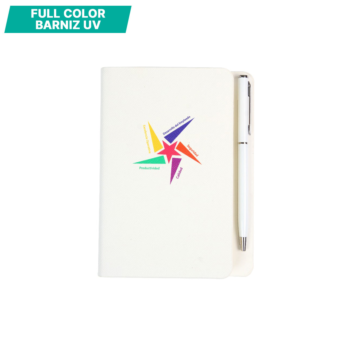 Libreta fabricada en curpiel con imán porta pluma, 80 hojas de raya y bolígrafo metálico tinta negra.