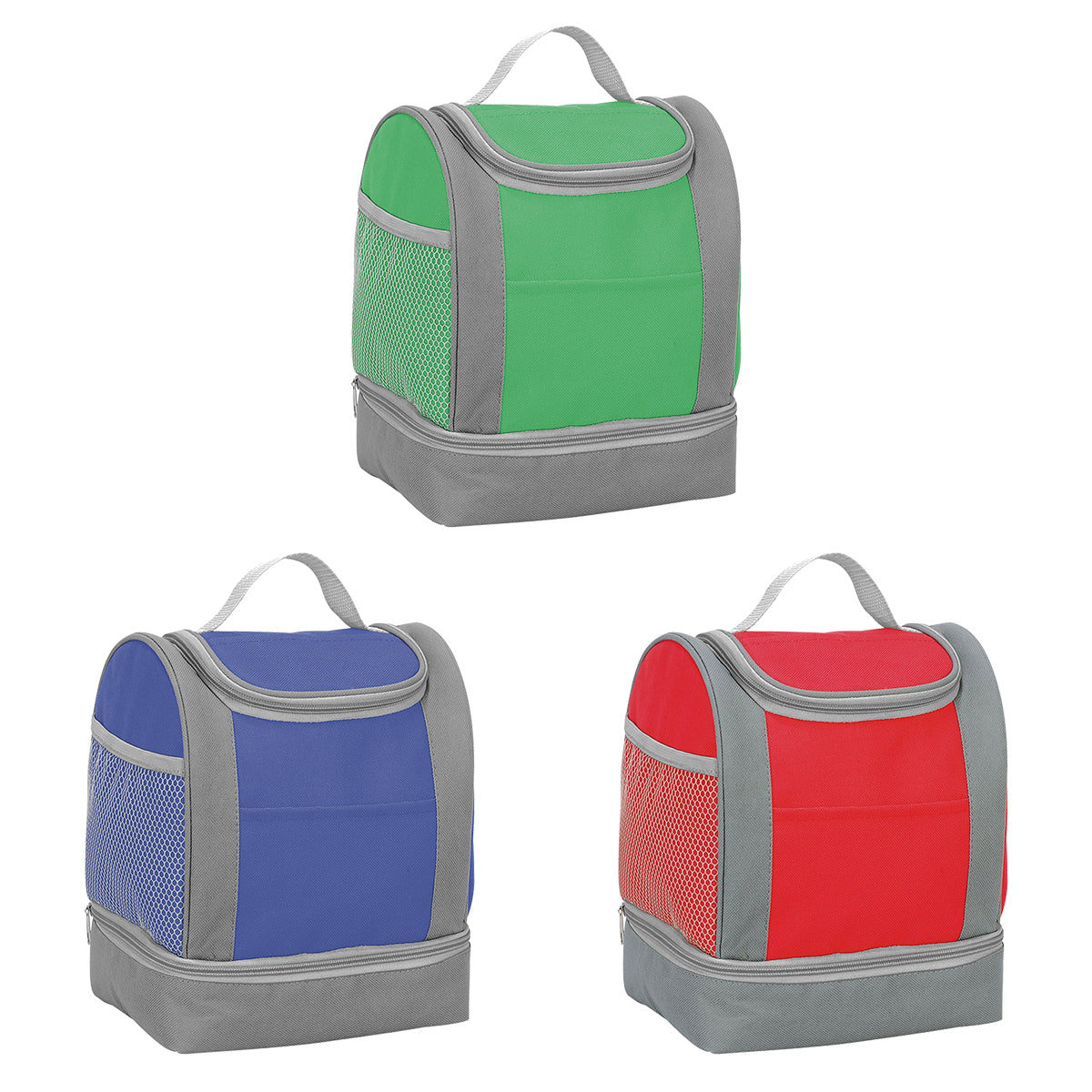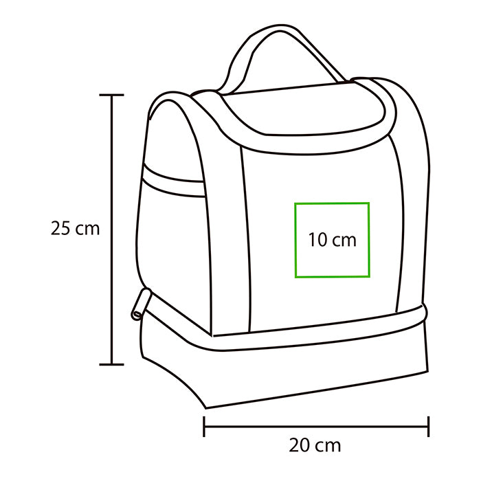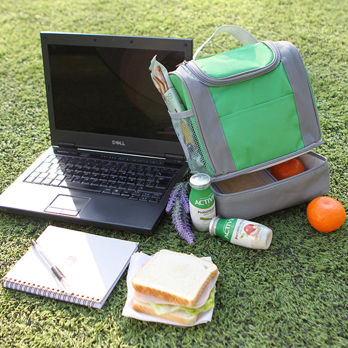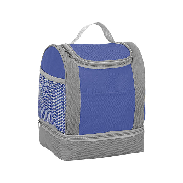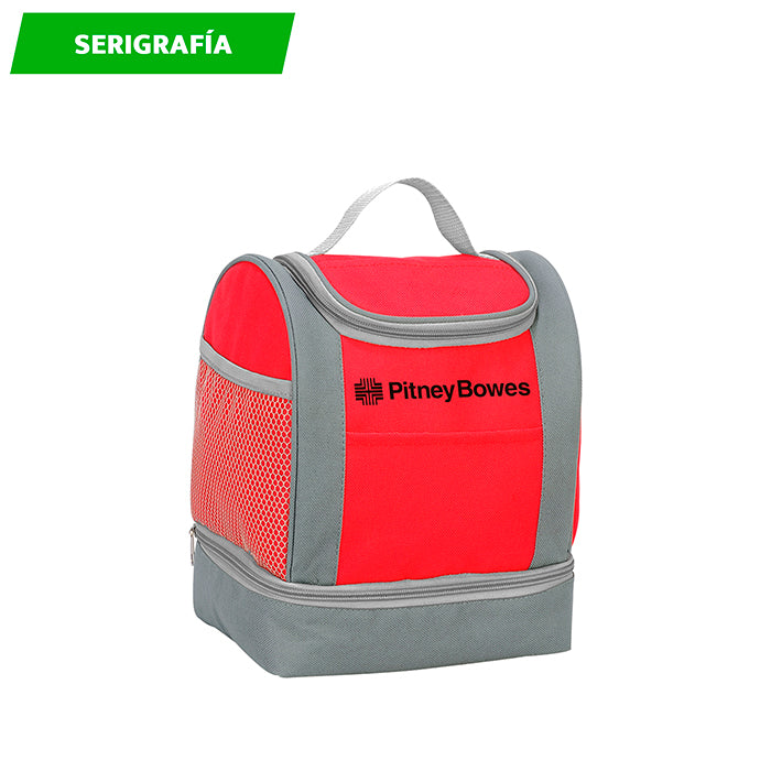 Lonchera doble fabricada en nylon y bolsa tipo red a un costado, con múltiples compartimientos, con detalles en color gris.