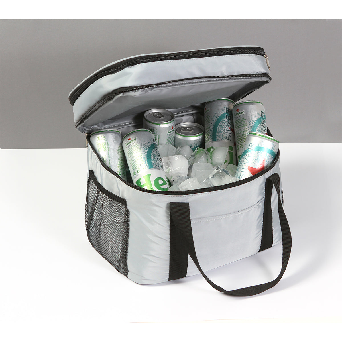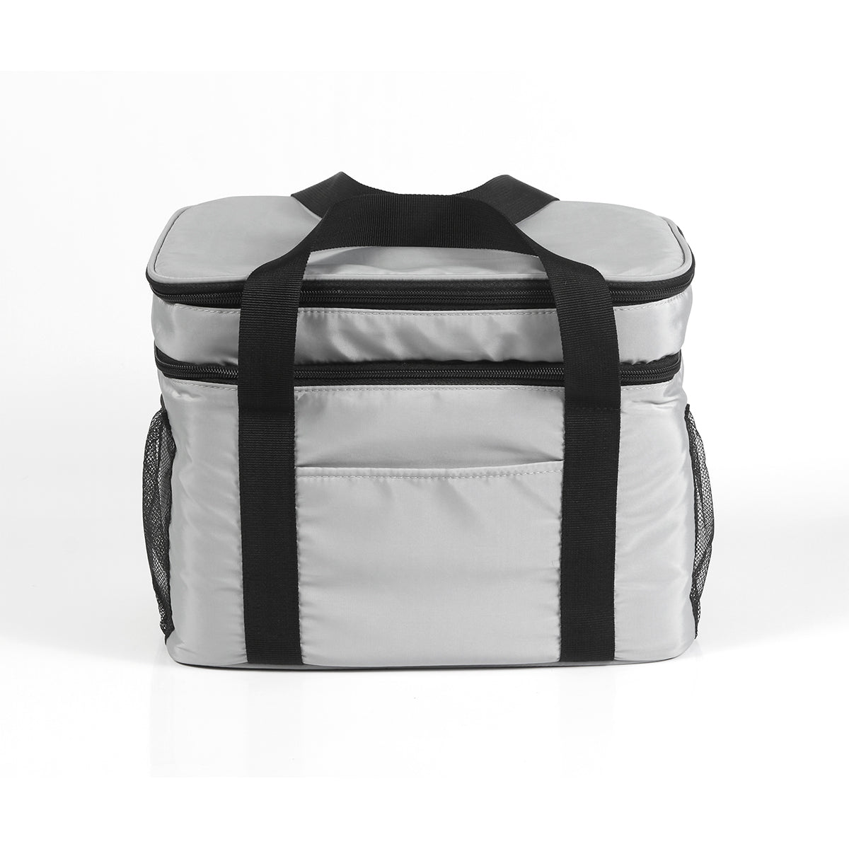 Hielera térmica fabricada en poliéster con forro de PU, ideal para llevar tus comidas y bebidas de forma segura y mantener su temperatura durante más tiempo, cuenta con dos compartimentos principales que te permiten organizar tus alimentos y bebidas, también cuenta con un bolsillo frontal con cierre de cremallera, donde puedes guardar artículos más pequeños como llaves, tarjetas o paquetes de condimento, asas superiores que son cómodas y resistentes, trae aparte una correa para transportarla colgada en el hombro la cual es ajustable y desmontable.