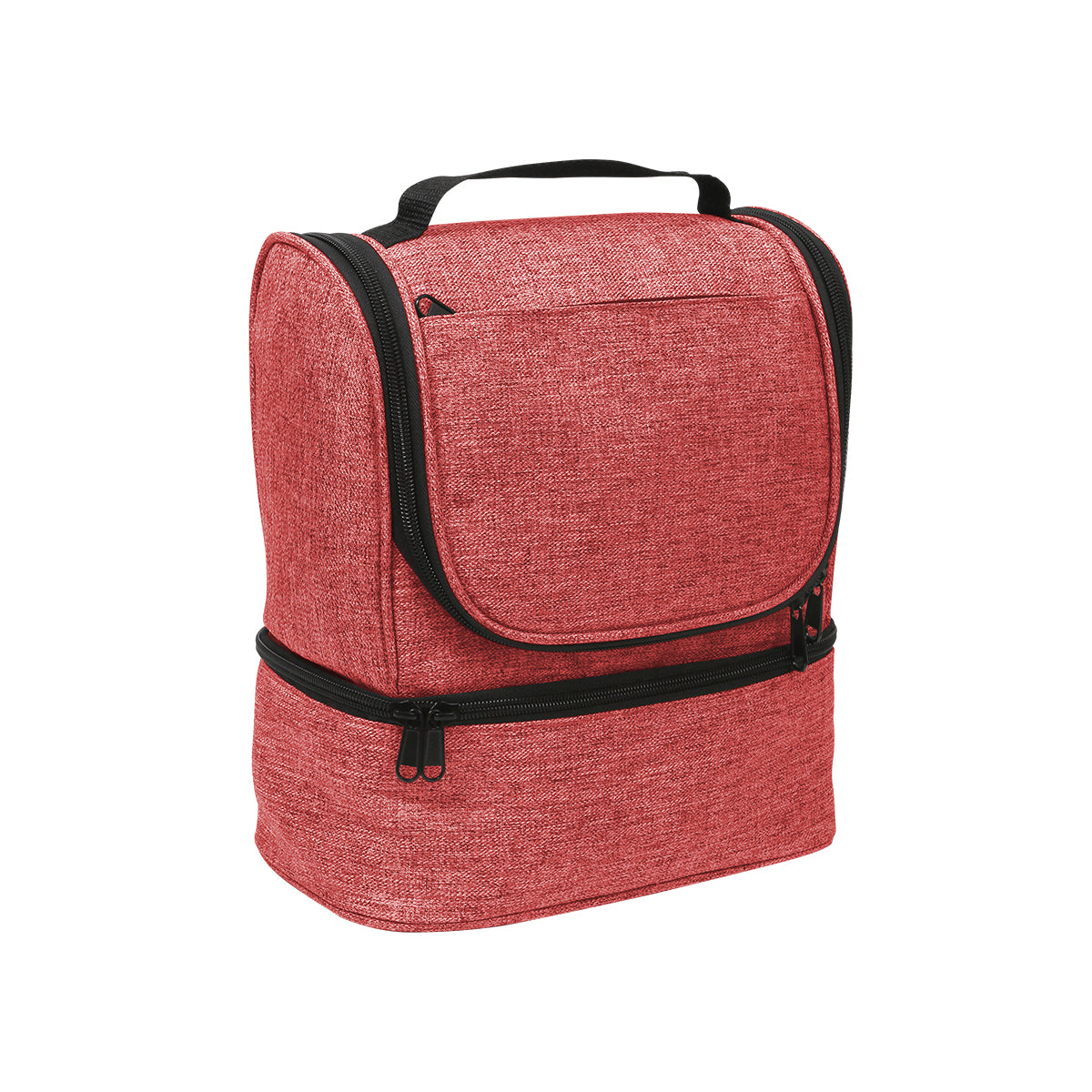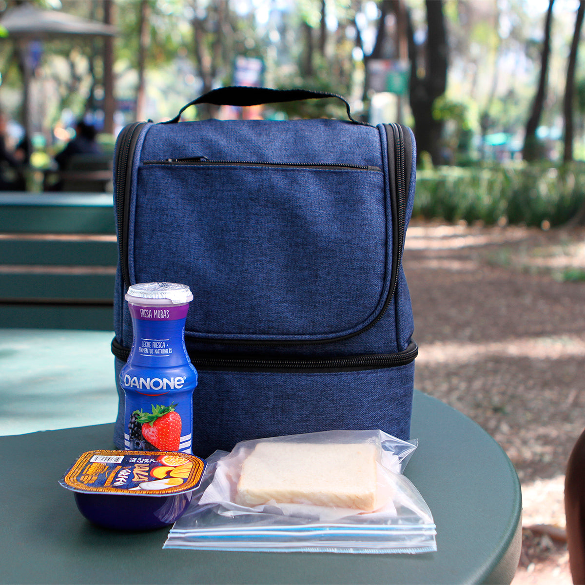 Lonchera fabricada en poliéster. Cuenta con: compartimento inferior, bolsillo frontal y asa superior.