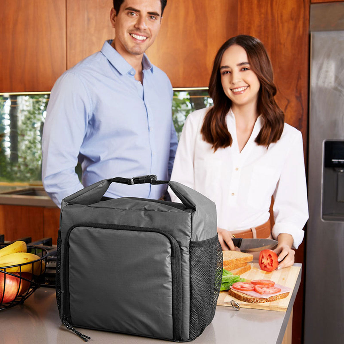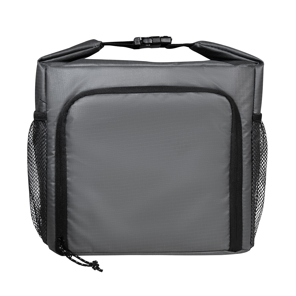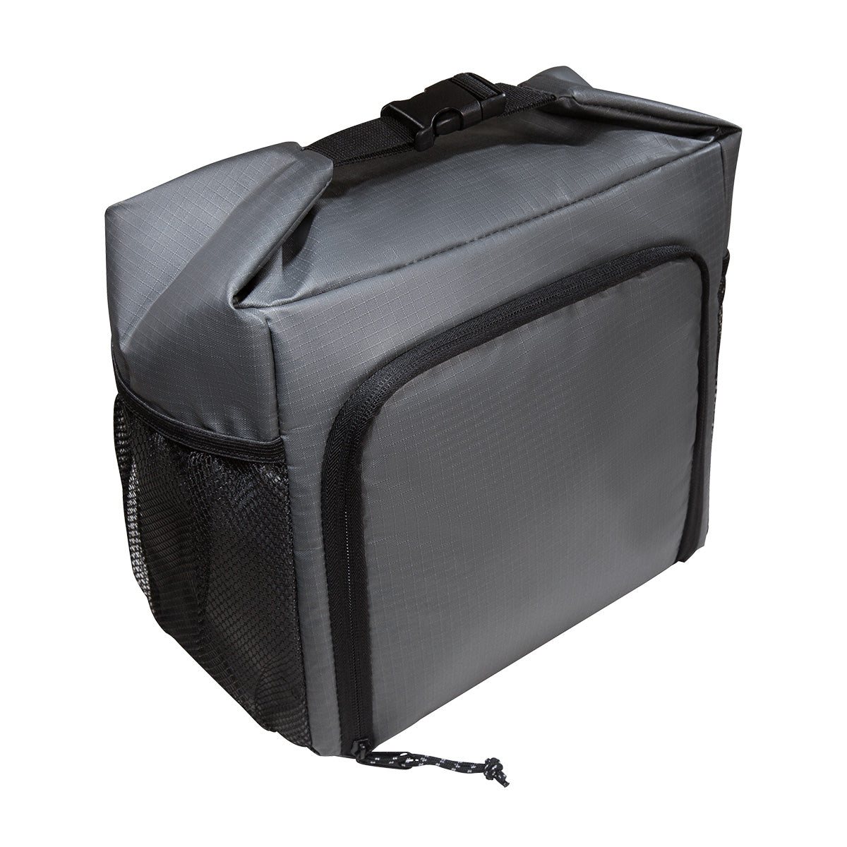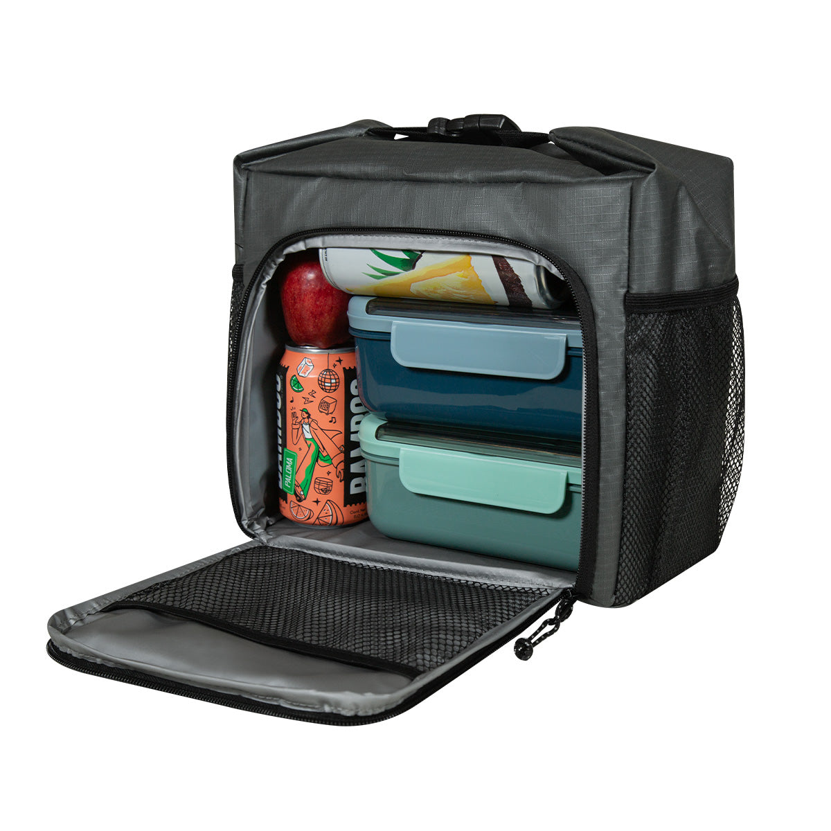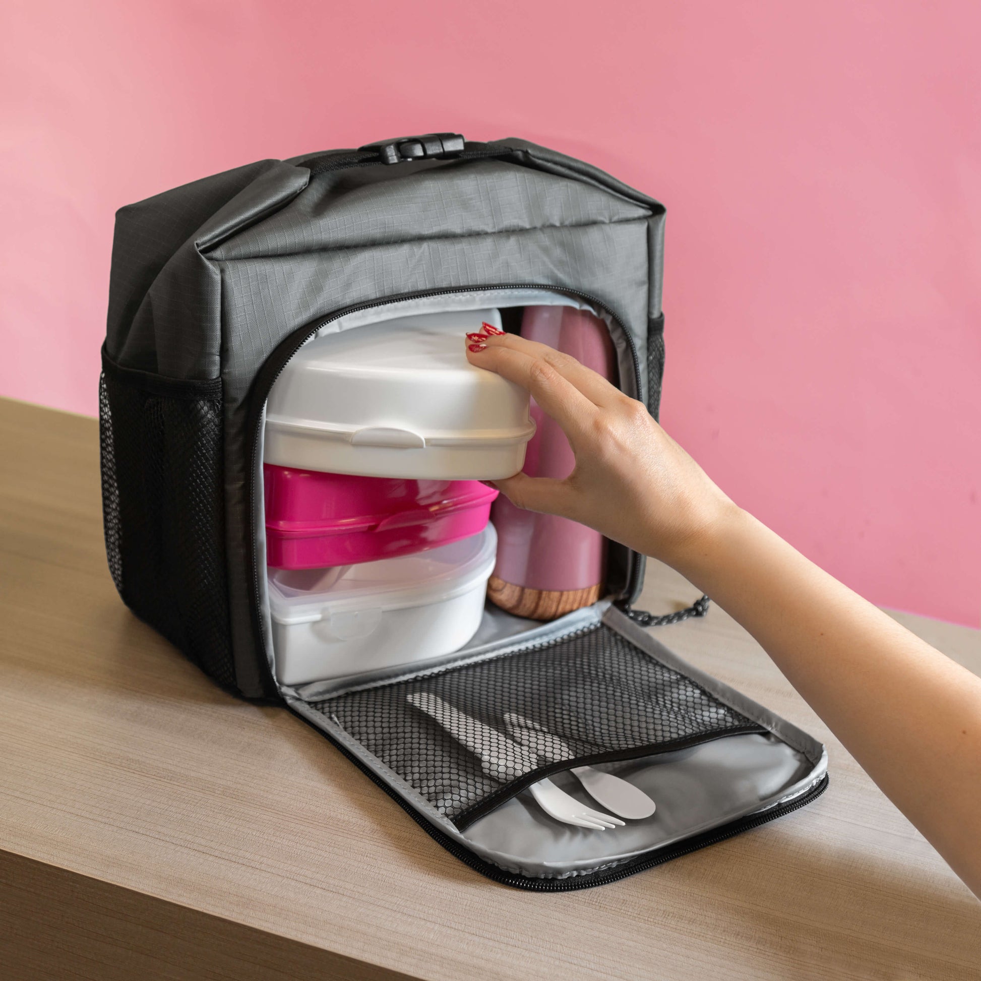 LONCHERA CON INTERIOR PLASTIFICADO. CUENTA CON BOLSILLO PRINCIPAL FRONTAL CON CIERRE PARA ALMACENAR ALIMENTOS DE FORMA SEGURA. EN AMBOS LATERALES, CUENTA CON UN BOLSILLO DE MALLA, IDEAL PARA BOTELLAS DE AGUA U OTROS ARTICULOS DE ACCESO RAPIDO. EN LA PARTE SUPERIOR, INTEGRA UN ASA CON BROCHE DE PLASTICO QUE FACILITA SU PORTABILIDAD. CAPACIDAD PARA 12 LATAS.