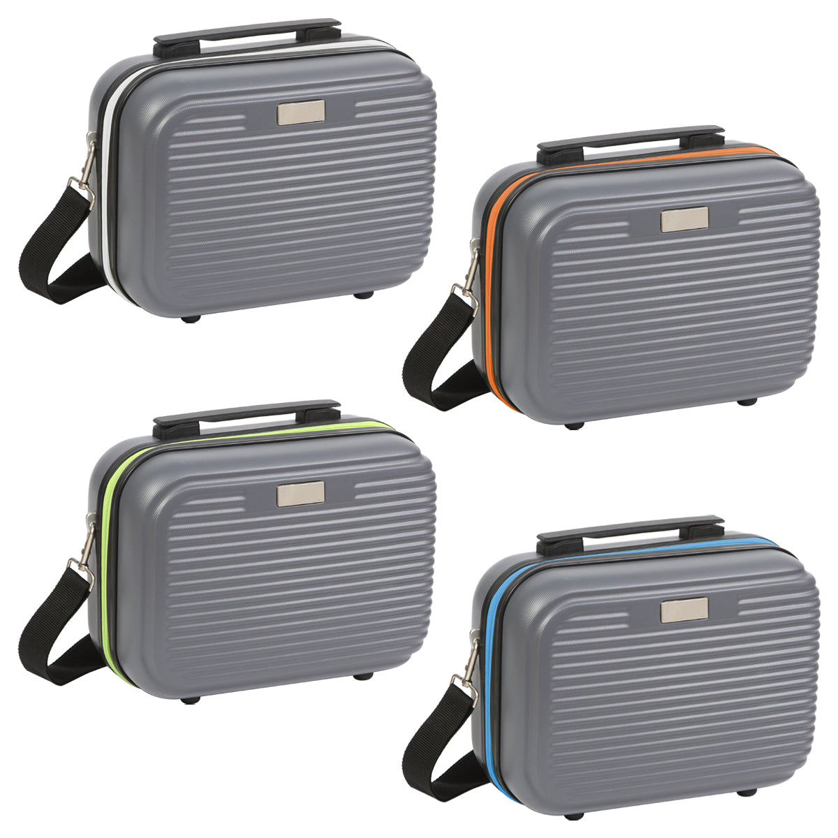 Neceser para viaje fabricado en plástico ABS con interiores de poliéster. Incluye placa metálica, banda elástica y colgante, con correa para el hombro ajustable, con un detalle a color en la parte del cierre del Necer. Este te proporcionará el espacio adecuado para todos tus artículos personales tendrás suficiente espacio para acomodar todos tus artículos personales esenciales, como productos de higiene, cosméticos, pequeños accesorios y mucho más. Capacidad de carga de 5 kg.