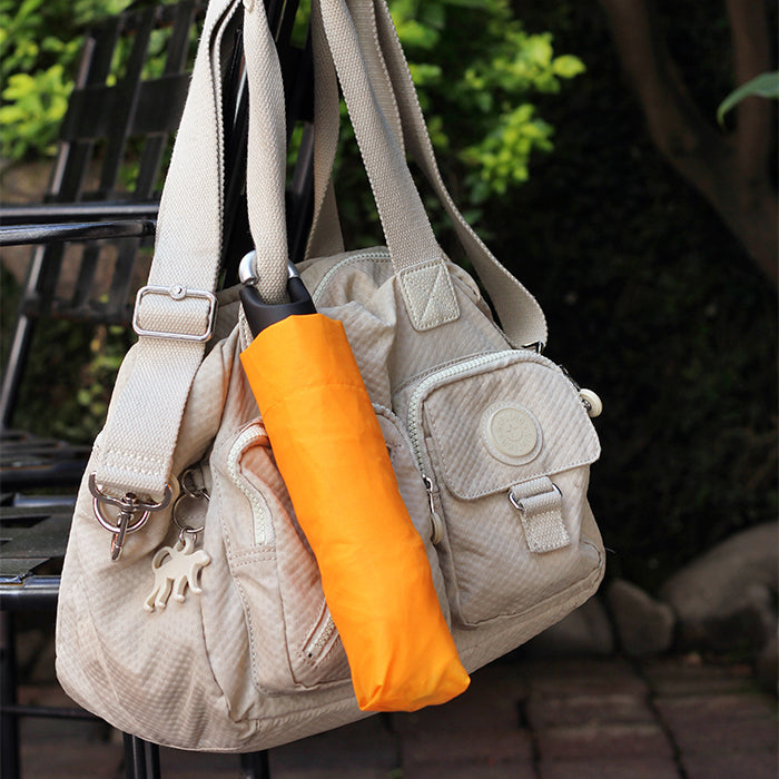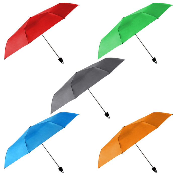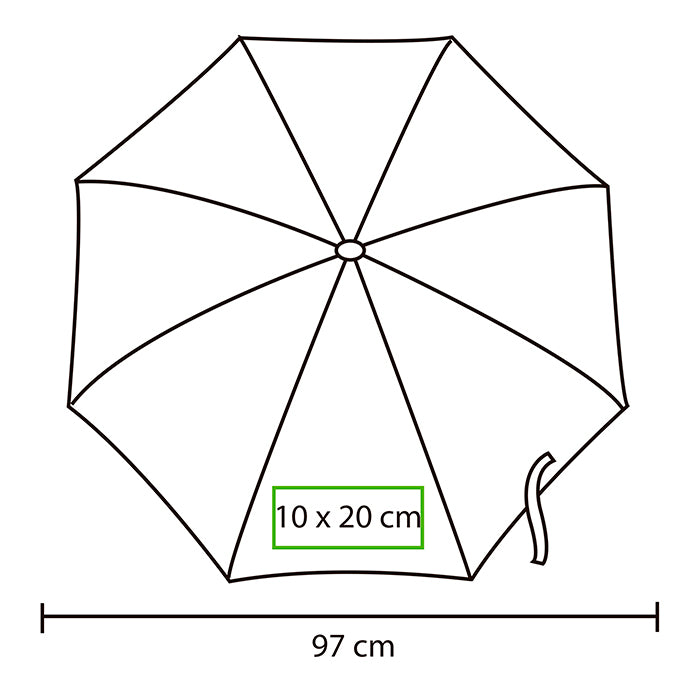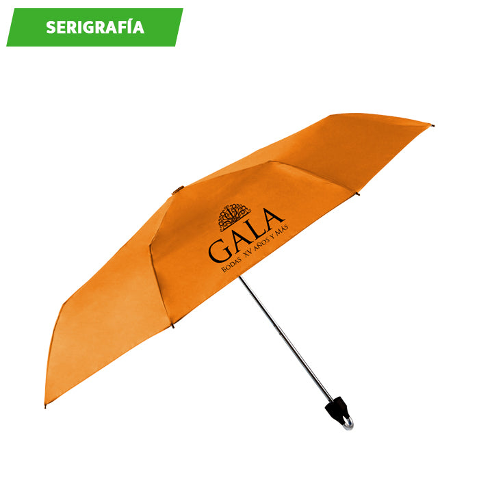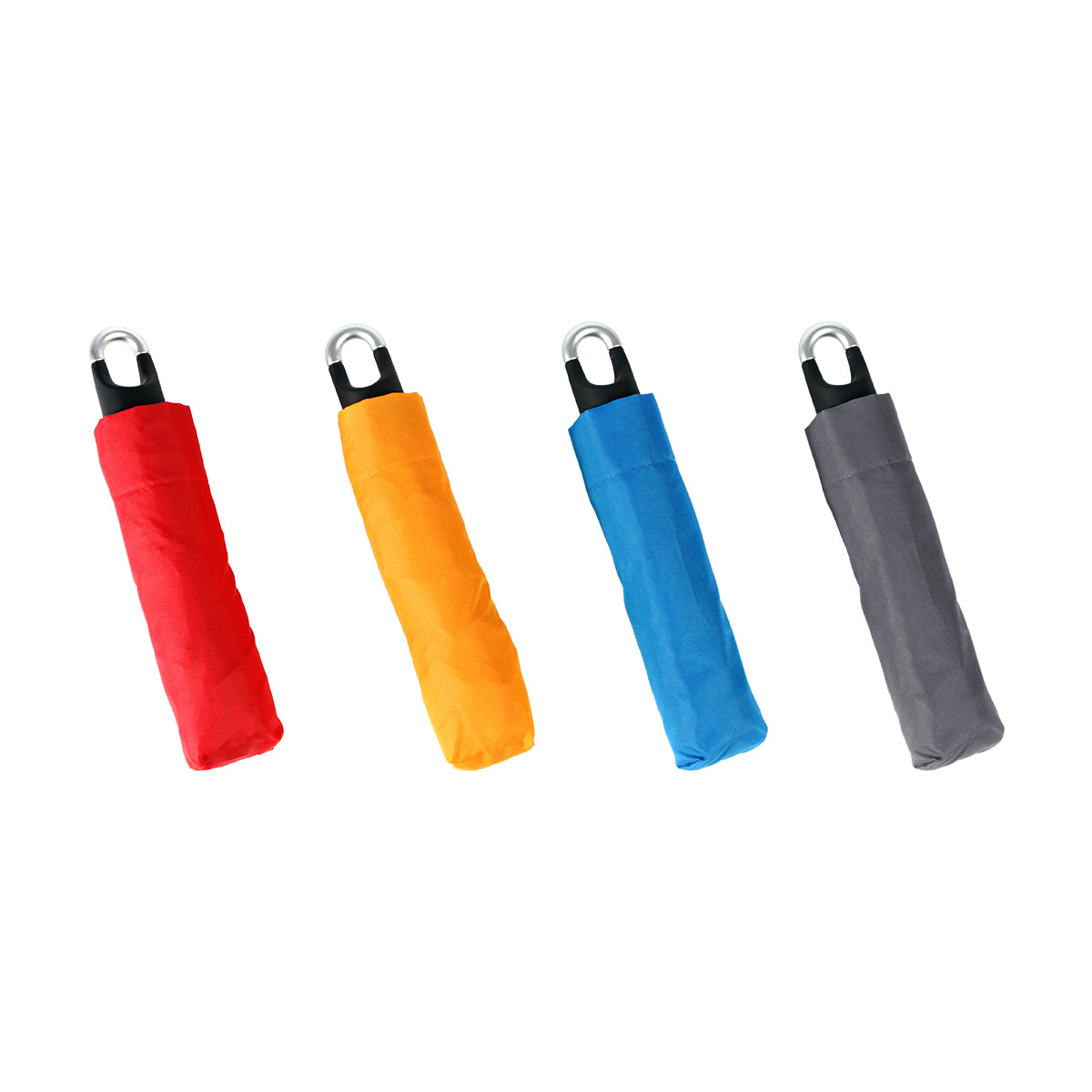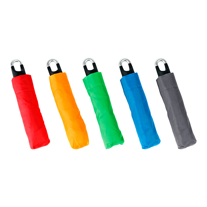 Paraguas de bolsillo fabricado en pongee con 8 gajos, mango con clip y funda.