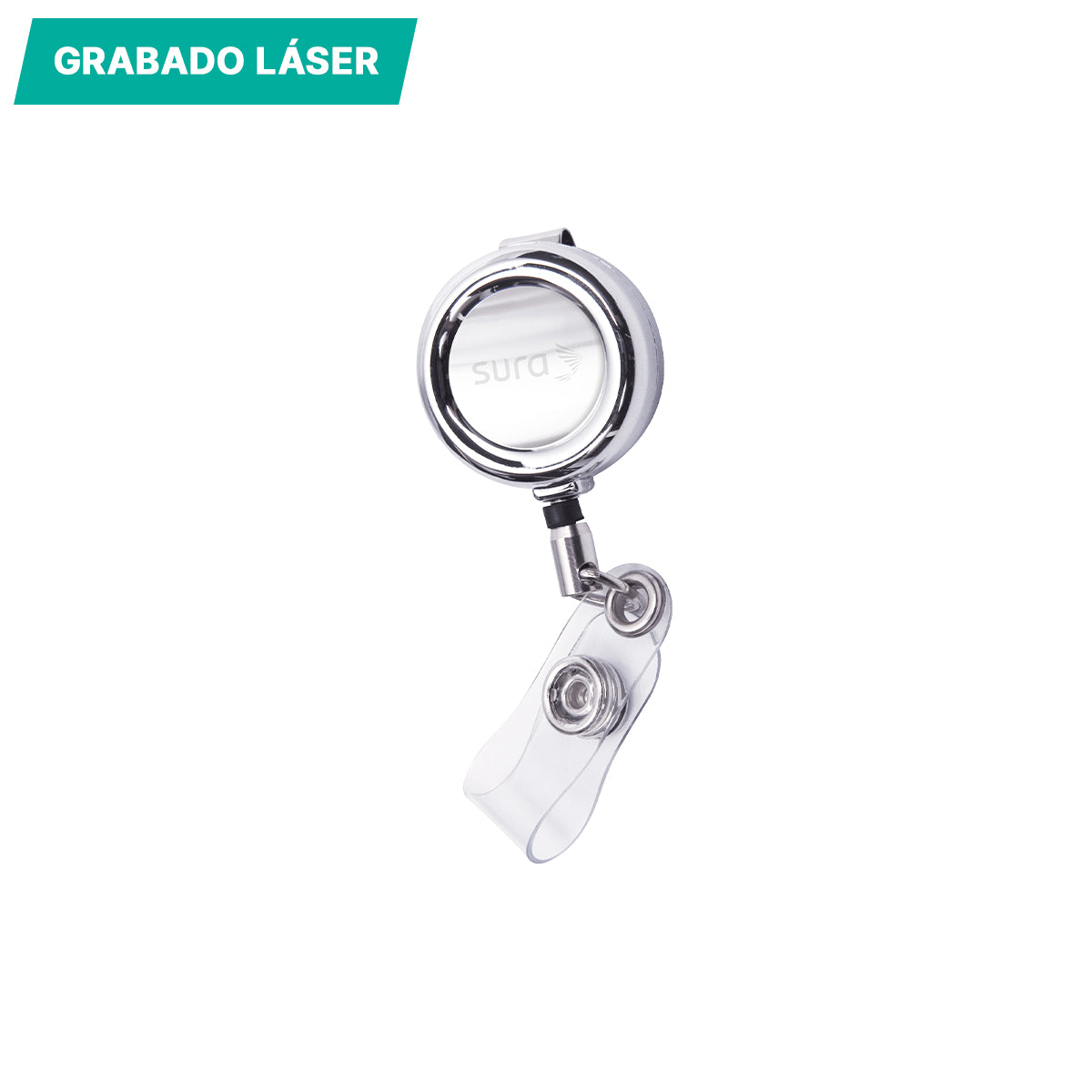 Porta gafete metálico retráctil. Incluye caja de cartón individual.