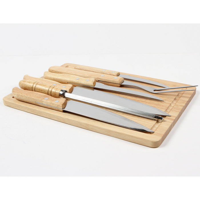 Set de BBQ fabricado en acero inoxidable y mangos de roble, incluye 7 piezas (cuchillo de chef, cuchillo pequeño, cuchillo deshuesador, cuchillo para carne, tenedor, afilador y tabla para cortar).