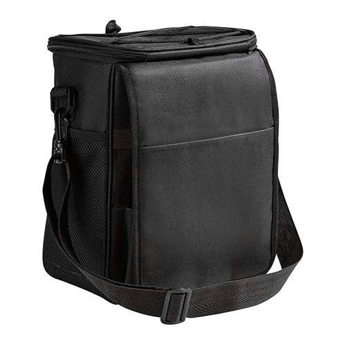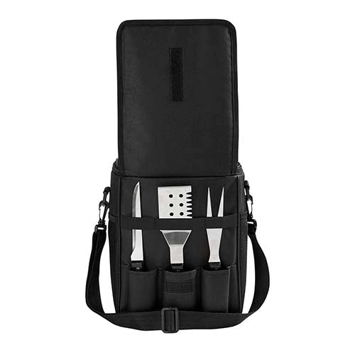 BOLSA PRINCIPAL CON FUNCIÓN DE HIELERA. CAPACIDAD PARA 12 LATAS. INCLUYE BOLSA FRONTAL CON 3 COMPARTIMENTOS INTERNOS PARA EL SET DE CUCHILLO, ESPÁTULA Y TENEDOR. 2 BOLSAS LATERALES DE RED Y CORREA AJUSTABLE.