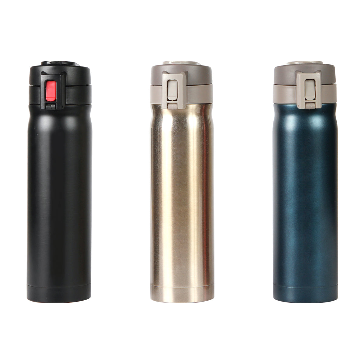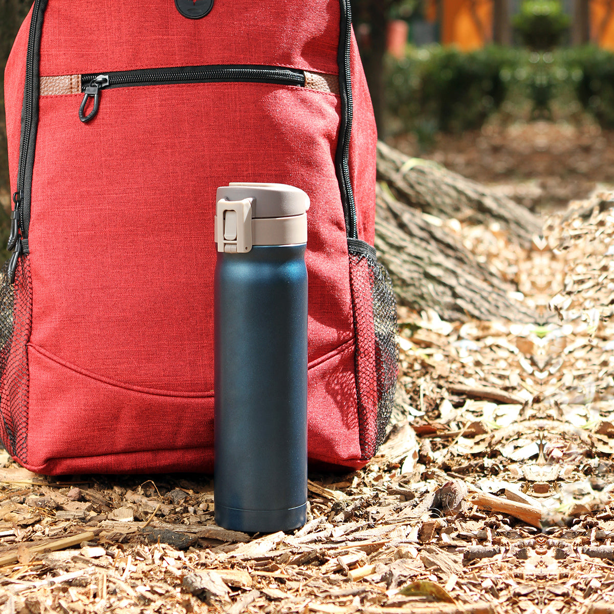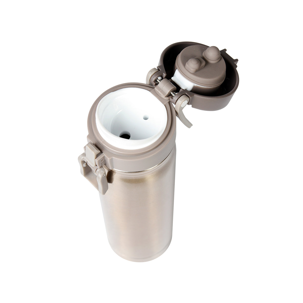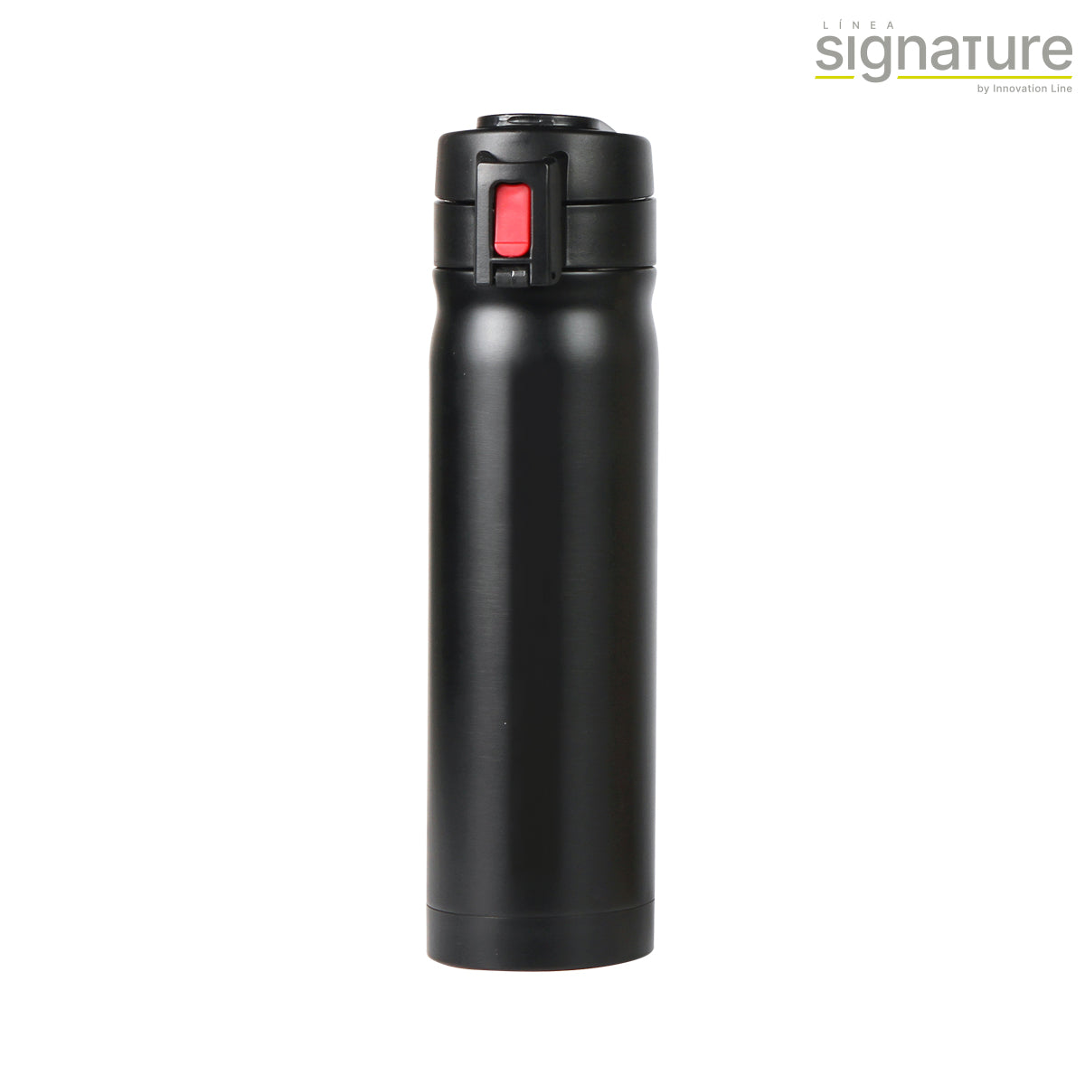 Termo de acero inoxidable doble pared con tapa con seguro, fabricado en materiales de grado alimenticio, mantiene bebidas frías o calientes por un largo tiempo, no usar en microondas. Capacidad de 500 ml (17 oz). Incluye caja de cartón individual.