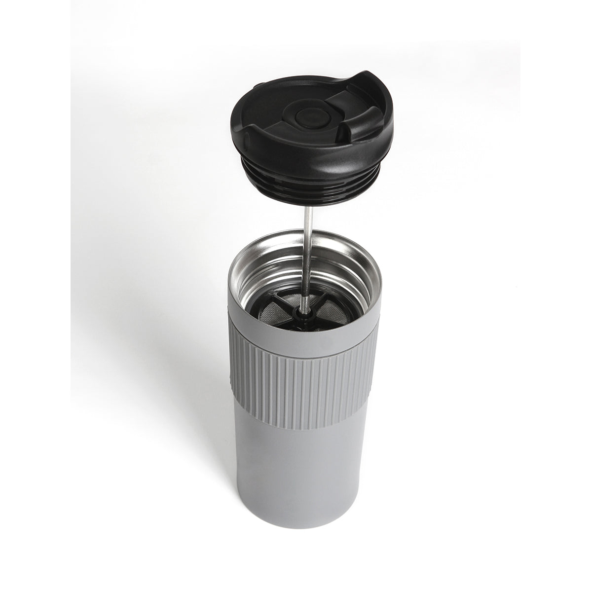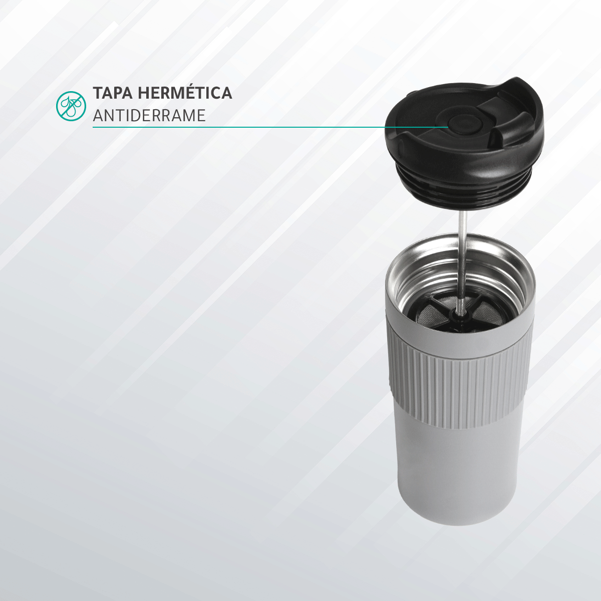 Termo de doble pared de acero inoxidable con manga de silicón con prensa francesa de acero inoxidable, tapa hermética anti derrame con cubierta de seguridad, fabricado en materiales de grado alimenticio, mantiene bebidas calientes por un largo tiempo, no usar en microondas. Capacidad de 480 ml. Incluye caja de cartón individual.