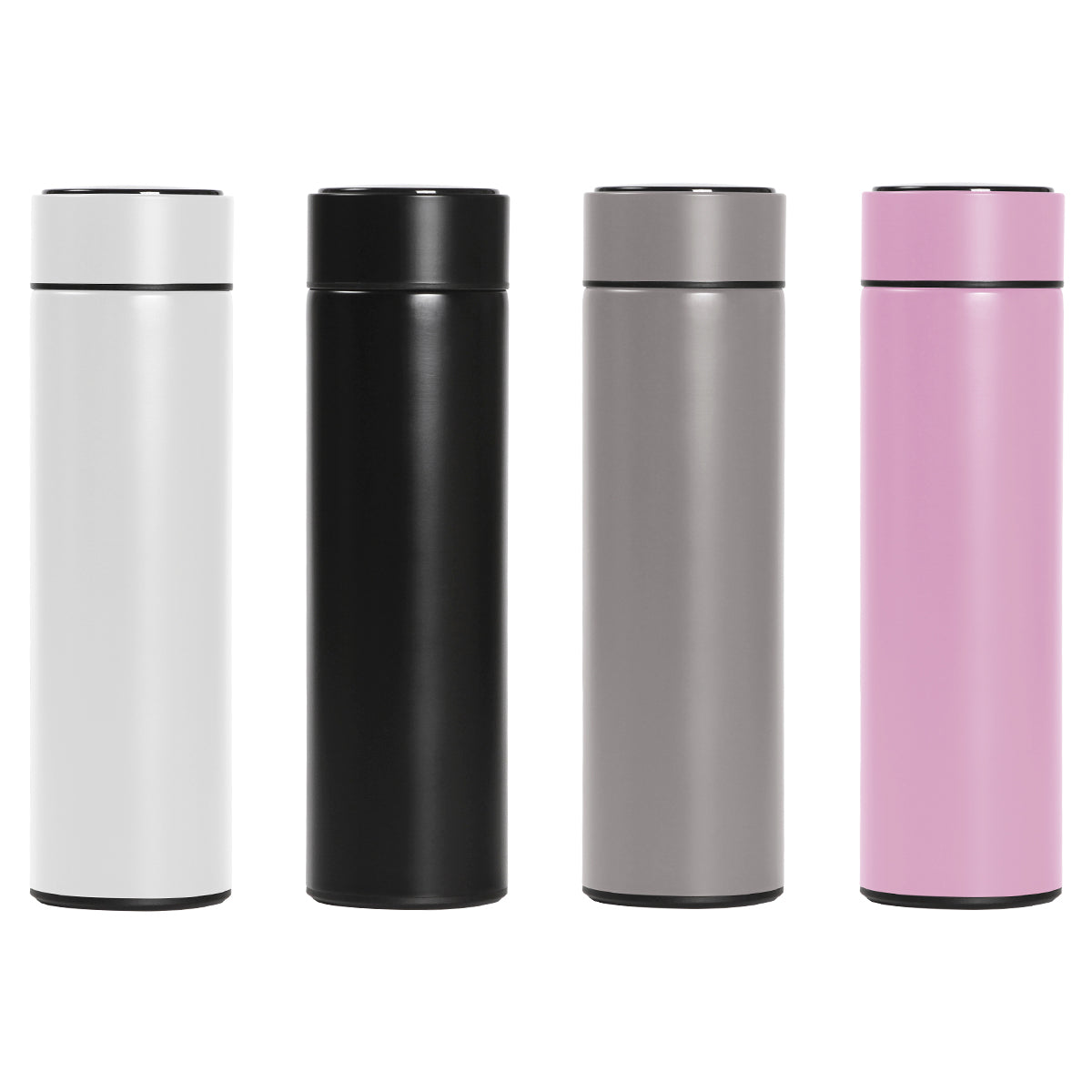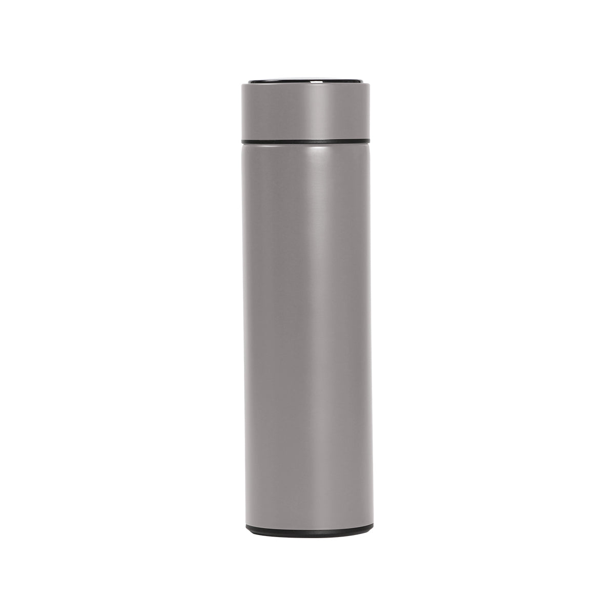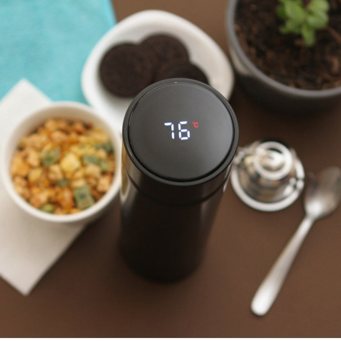 Termo inteligente de acero inoxidable doble pared; con pantalla LED indicadora de temperatura interior en la tapa. Fabricado en materiales de grado alimenticio, mantiene bebidas frías o calientes por un largo tiempo. La batería dura hasta 2 años. No usar en microondas. Capacidad de 500 ml. Incluye caja de cartón individual.