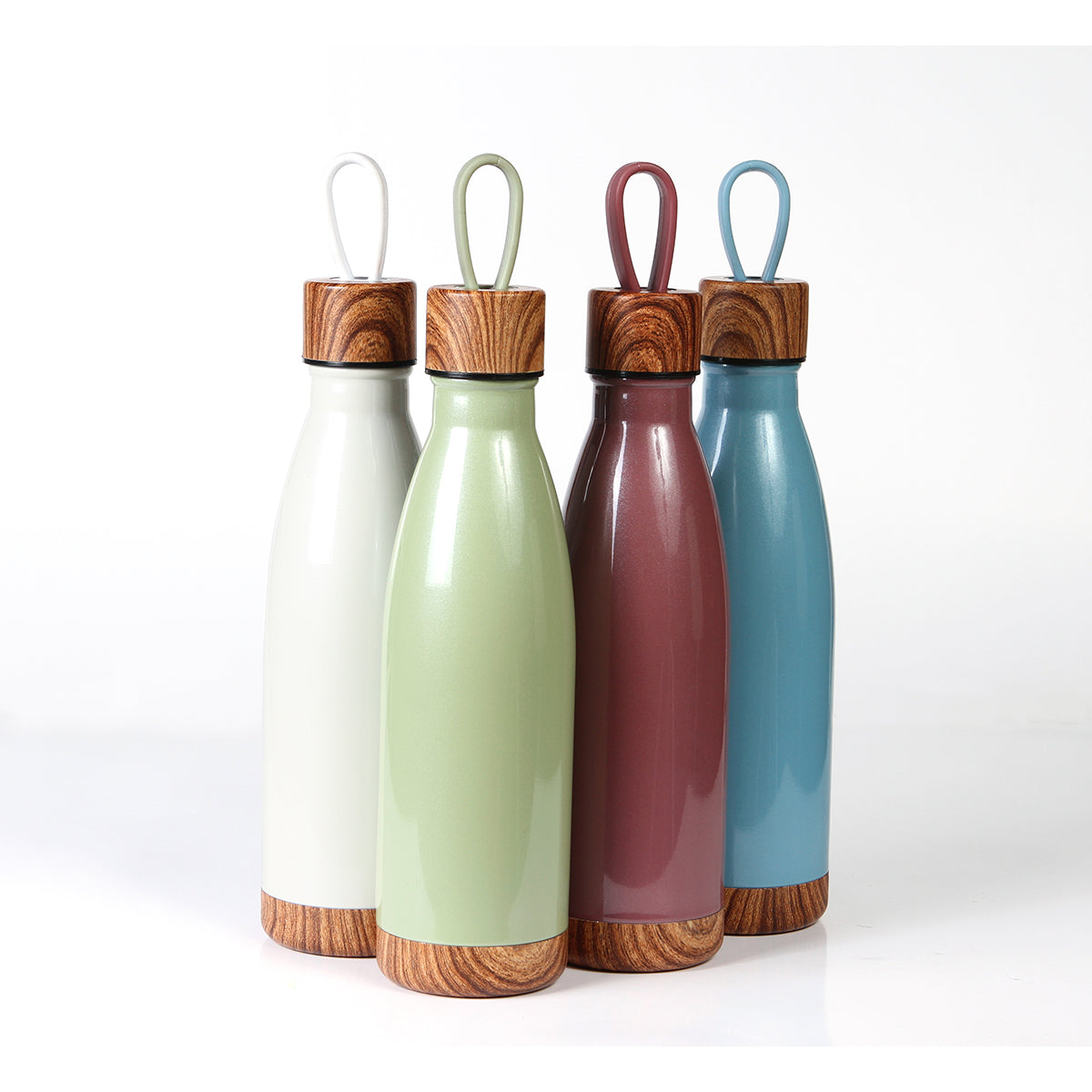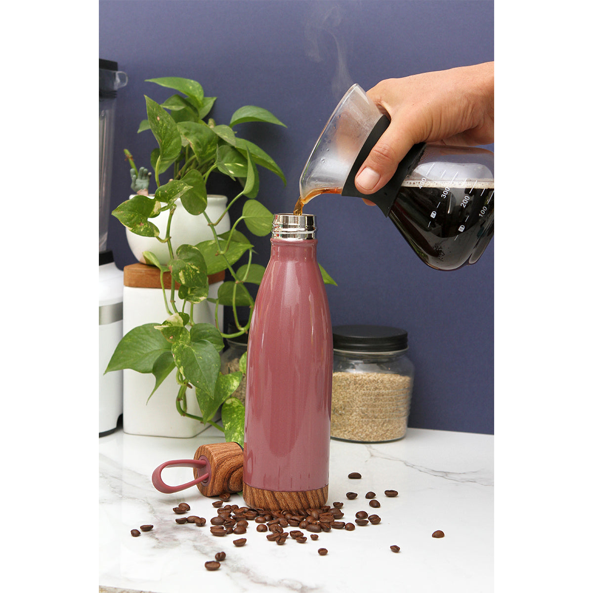 Termo de acero inoxidable doble pared, con correa de TPR, tapa de rosca con detalles apariencia madera, fabricado en materiales de grado alimenticio, mantiene bebidas frías o calientes por un largo tiempo, no usar en microondas. Capacidad de 500 ml (17 oz). Incluye caja de cartón individual.