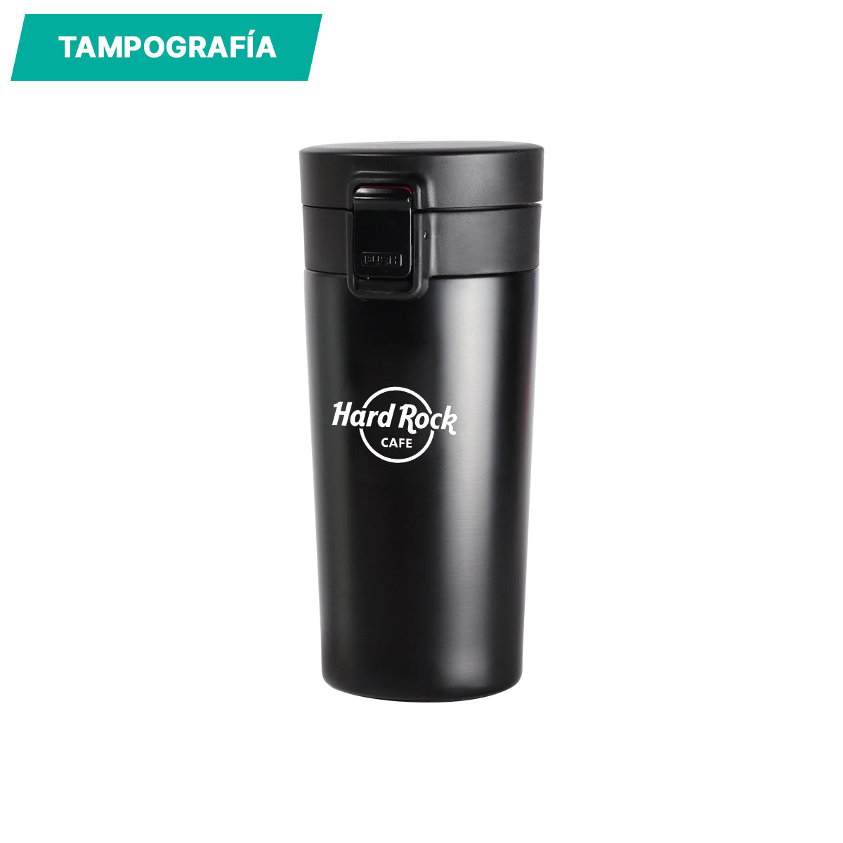 Termo de acero inoxidable doble pared con tapa de seguridad y sistema automático de apertura, fabricado en materiales de grado alimenticio, mantiene bebidas frías o calientes por un largo tiempo, no usar en microondas. Capacidad de 350 ml (12 oz).