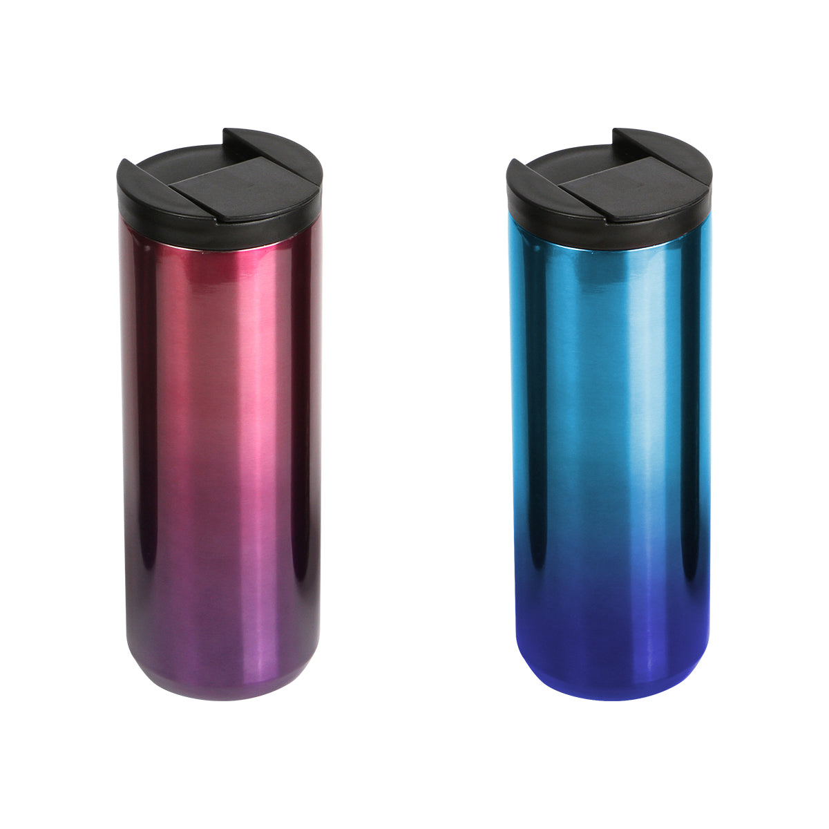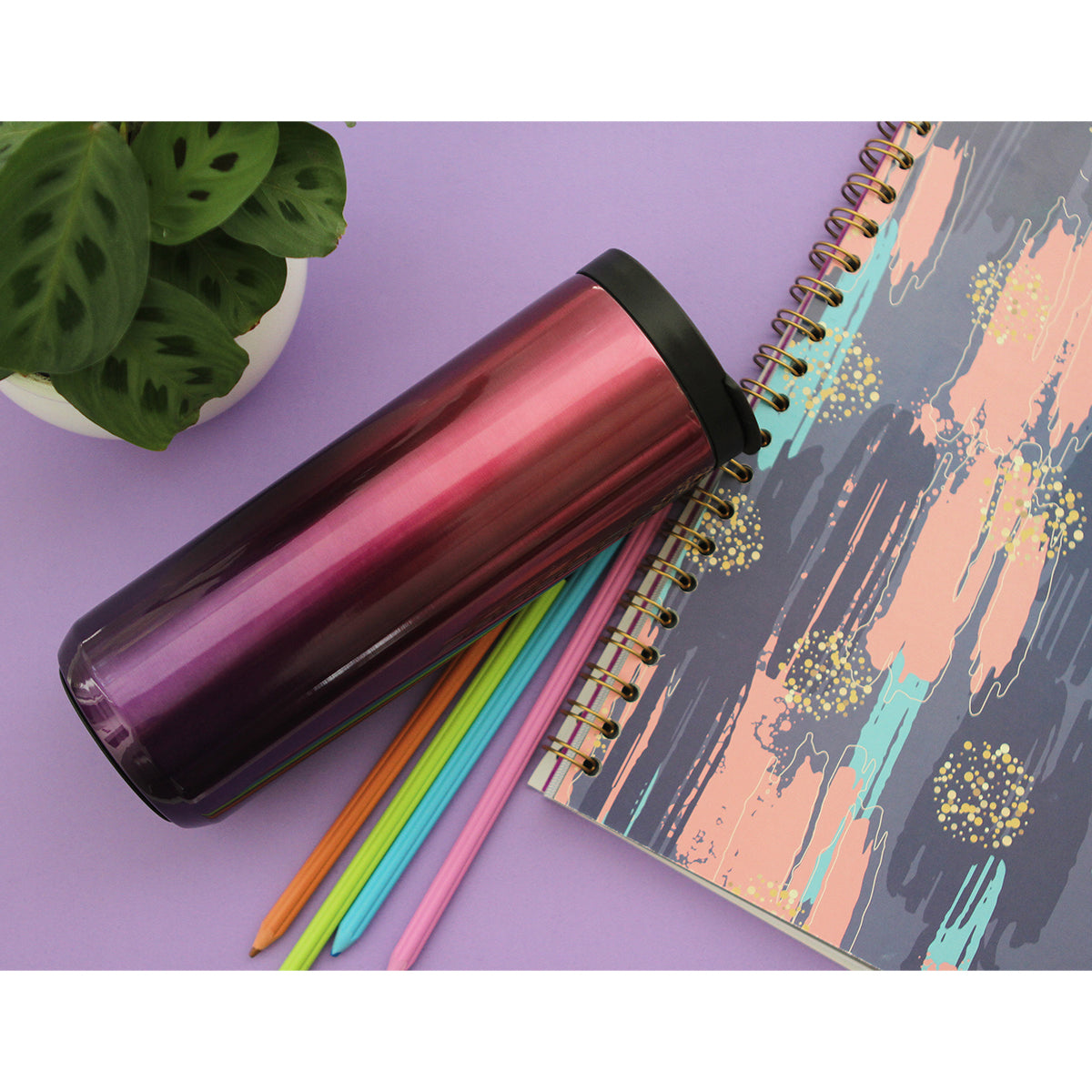 Termo doble pared de acero inoxidable con tapa plástica, cuerpo en colores degradados, mantiene bebidas frías o calientes por un largo tiempo. No usar en microondas. Capacidad de 500 ml. Incluye caja de cartón individual.