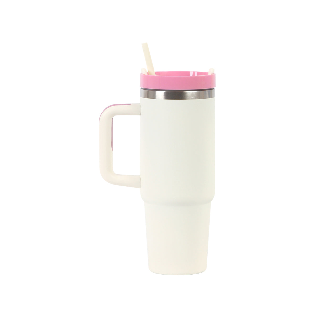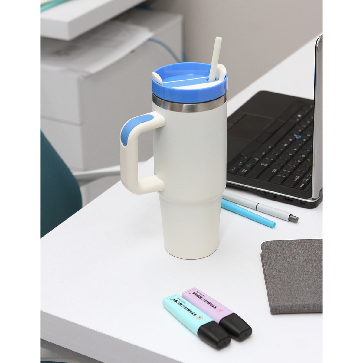 Termo de acero inoxidable 304 con asa, popote  y cuerpo blanco tiene una capacidad de 900 ml para mantener tus bebidas a la temperatura ideal, tapa de rosca en color con entrada hermética para popote y compartimento con boquilla, es perfecto para llevar a donde vayas. Además, viene en una caja individual lista para regalar.