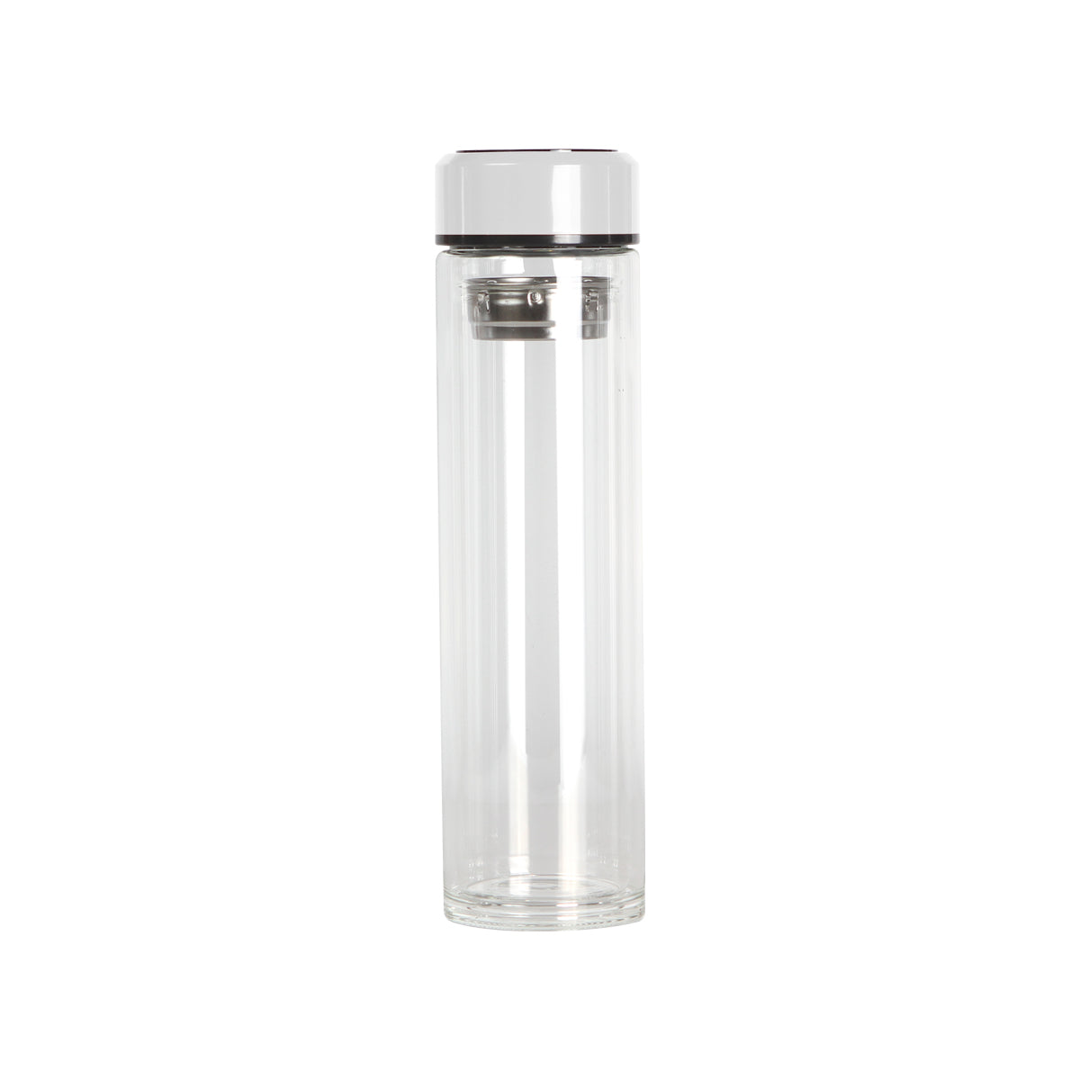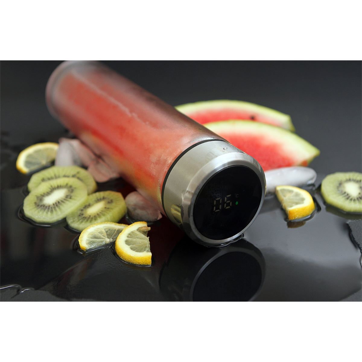 Termo inteligente de vidrio de borosilicato doble pared; con pantalla LED indicadora de temperatura interior en la tapa y rejilla para té.  Fabricado en materiales de grado alimenticio, mantiene bebidas frías o calientes por un largo tiempo. La batería dura hasta 2 años. No usar en microondas. Capacidad de 500 ml. Incluye caja de cartón individual.