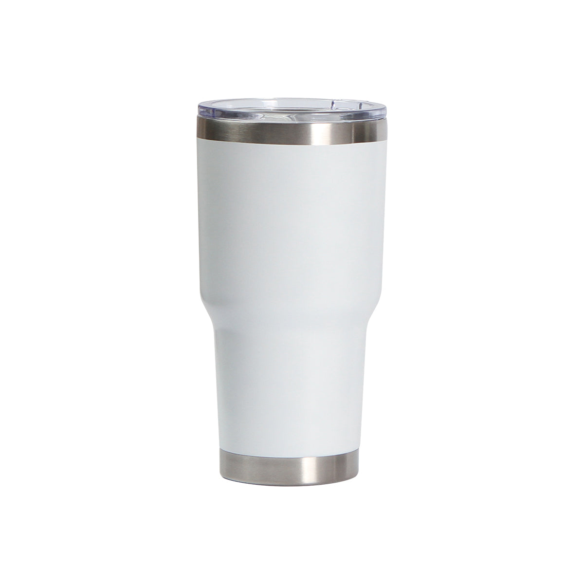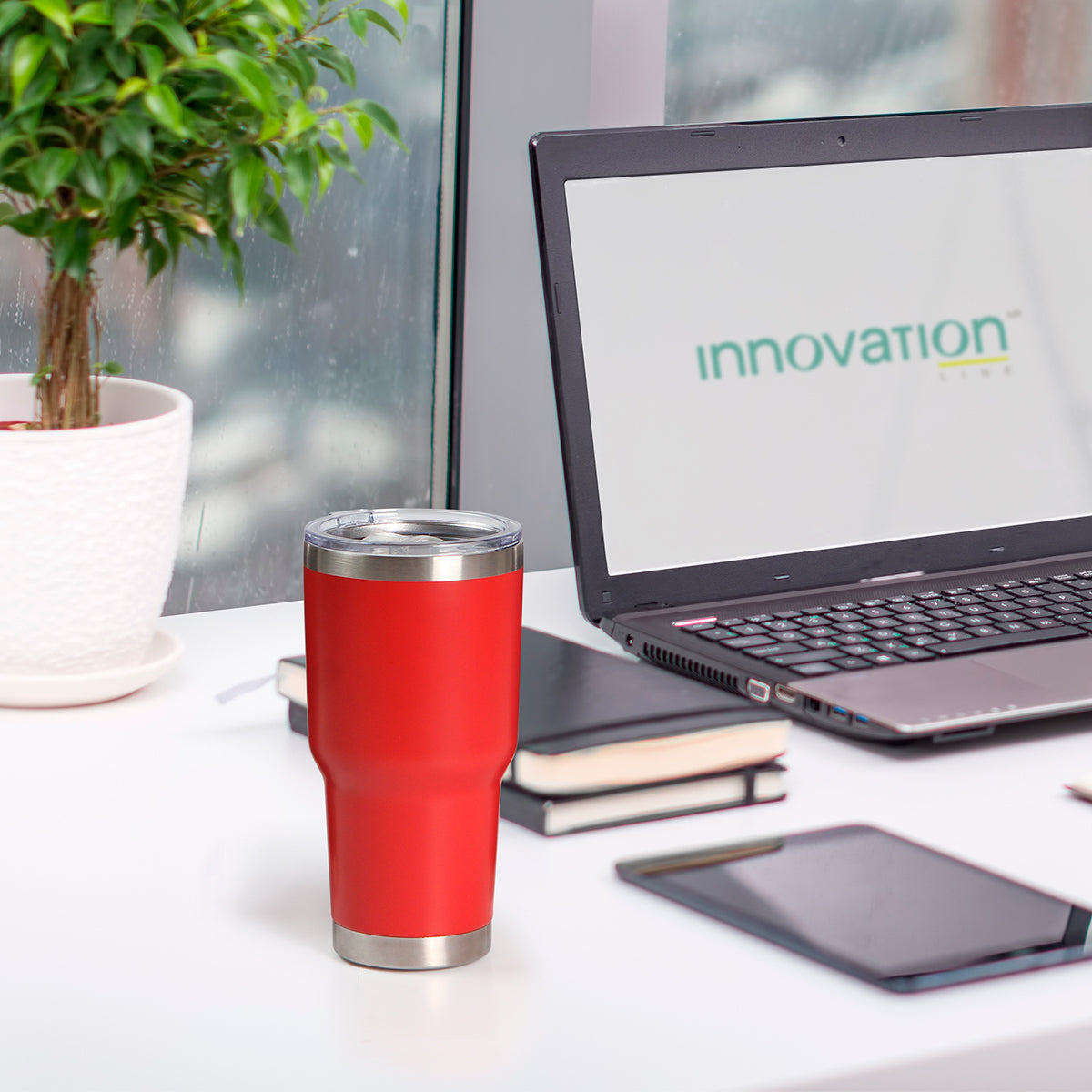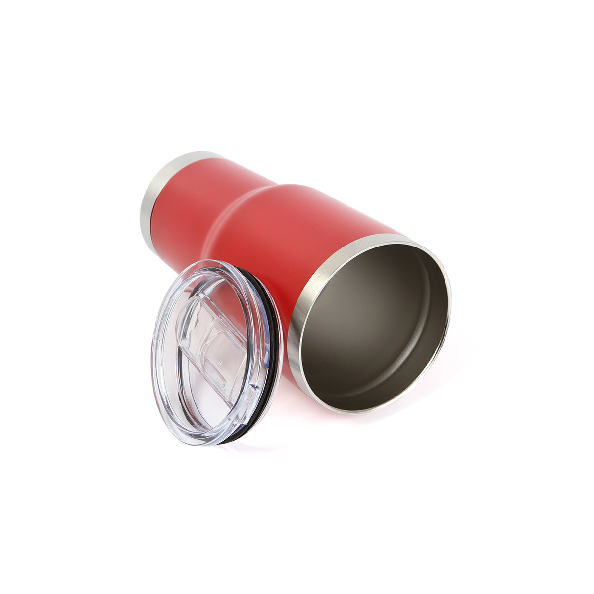 Termo de acero inoxidable doble pared acabado mate y detalles plateados en filo y base, con tapa deslizable de plástico transparente. Fabricado en materiales de grado alimenticio, mantiene bebidas frías o calientes por un largo tiempo. No usar en microondas.  Capacidad de 567 ml. Incluye caja de cartón individual.