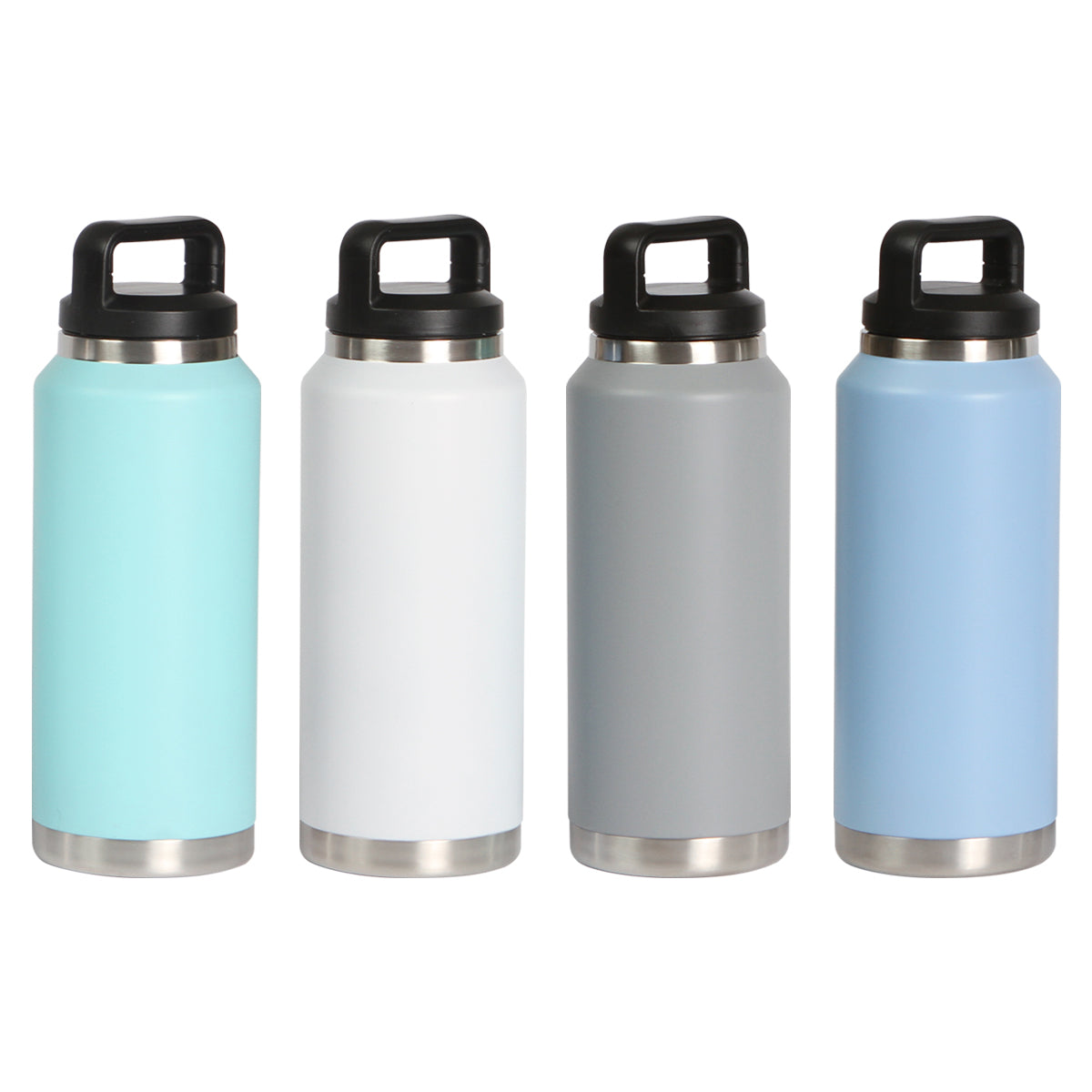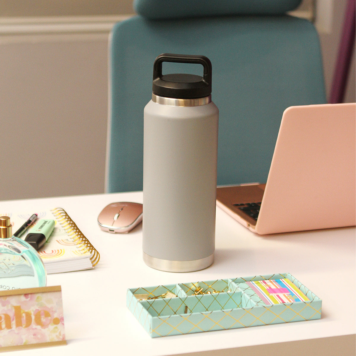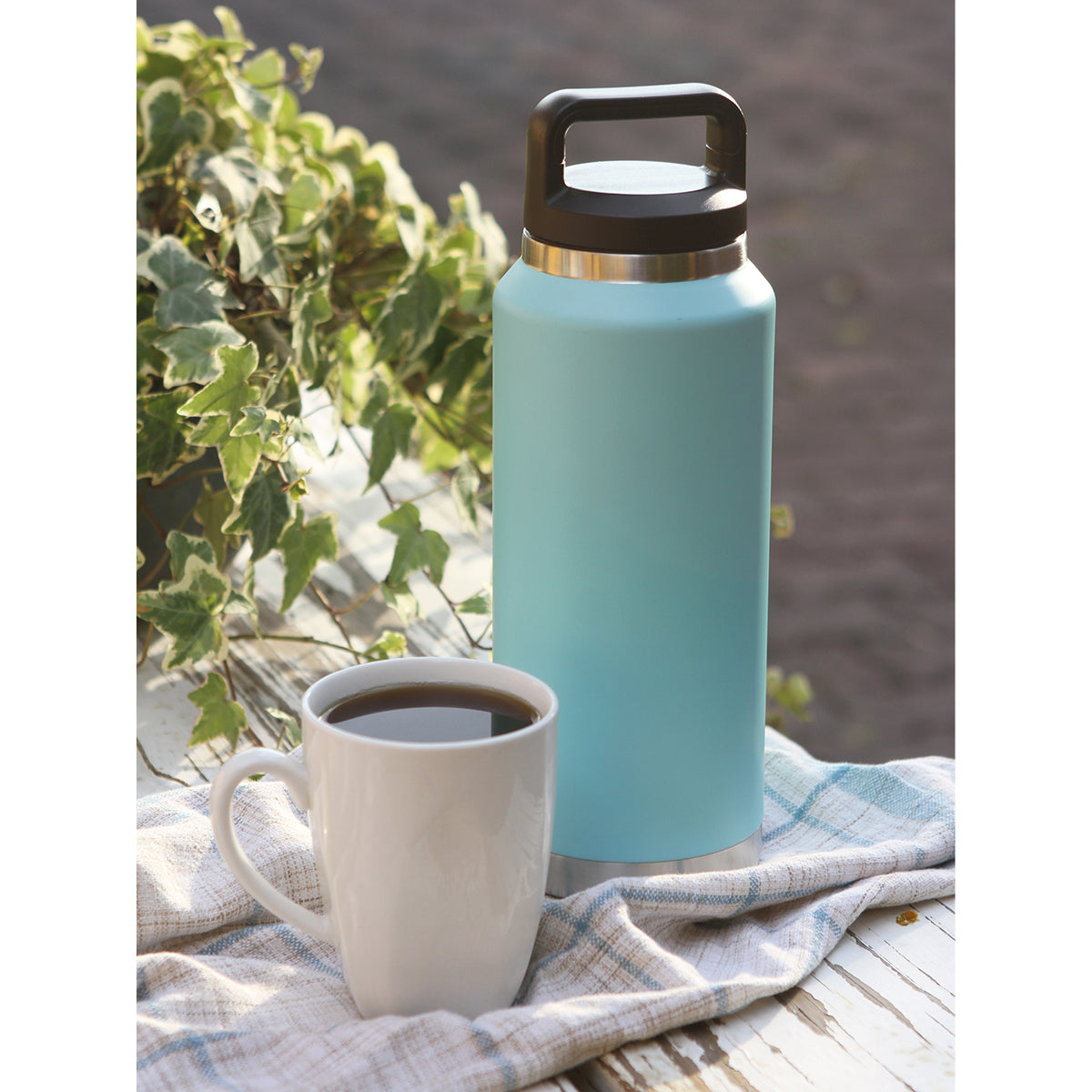 Termo de acero inoxidable doble pared con tapa de rosca y agarradera, detalles plata en base y boquilla. Fabricado en materiales de grado alimenticio, mantiene bebidas frías o calientes por un largo tiempo. No usar en microondas. Capacidad de 1000 ml. Incluye caja de cartón individual.