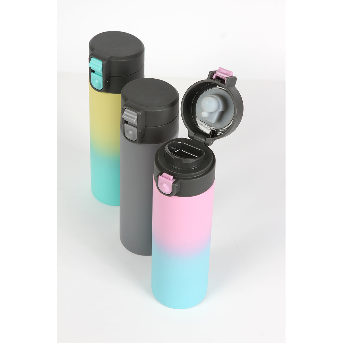 Termo bi-tono doble pared de acero inoxidable, con tapa plástica y botón de seguridad. Fabricado en materiales de grado alimenticio, mantiene bebidas calientes por un largo tiempo, no usar en microondas. Capacidad de 500 ml. Incluye caja de cartón individual.