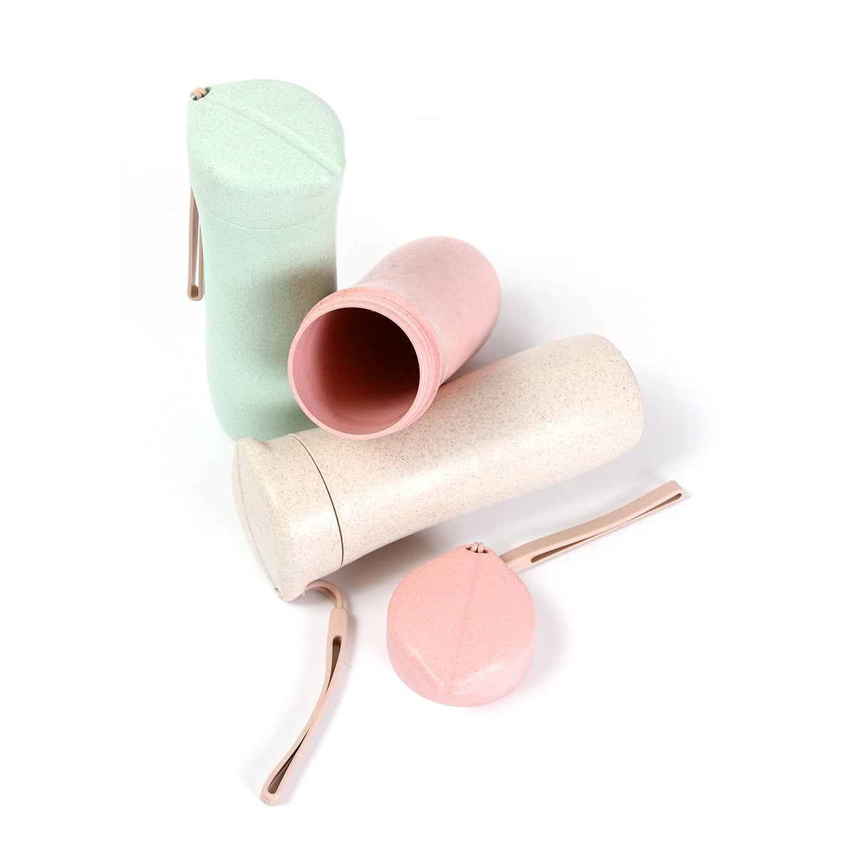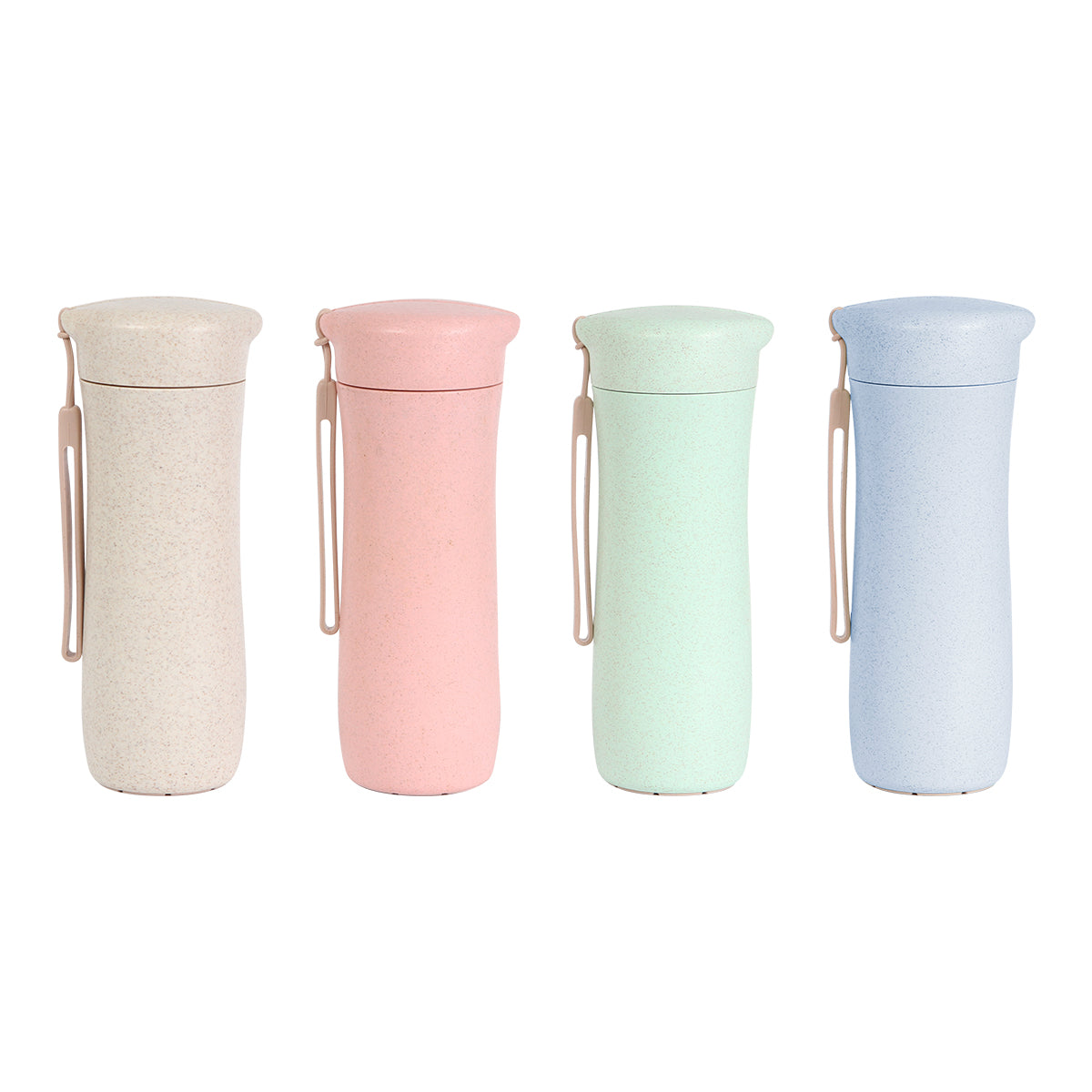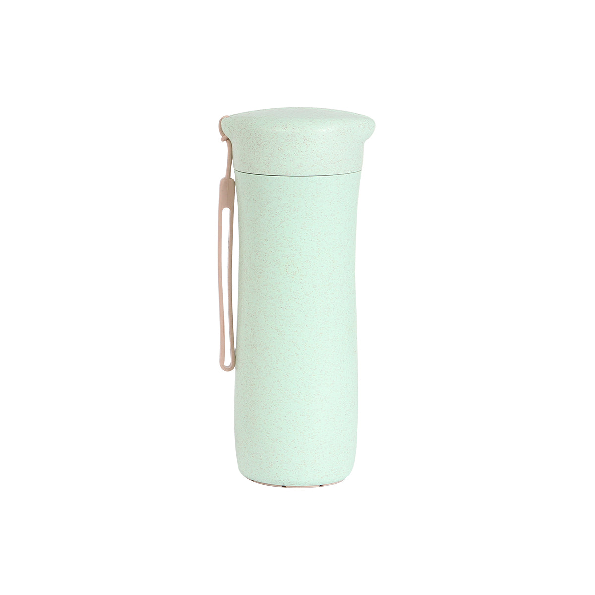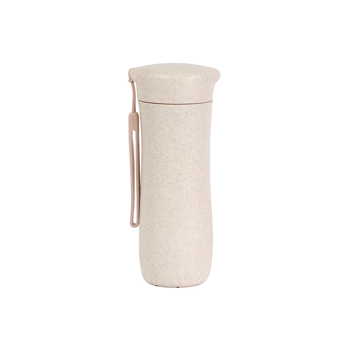 Termo deportiva fabricada en polipropileno (PP) y fibra de trigo, con correa. Capacidad de 360 ml.