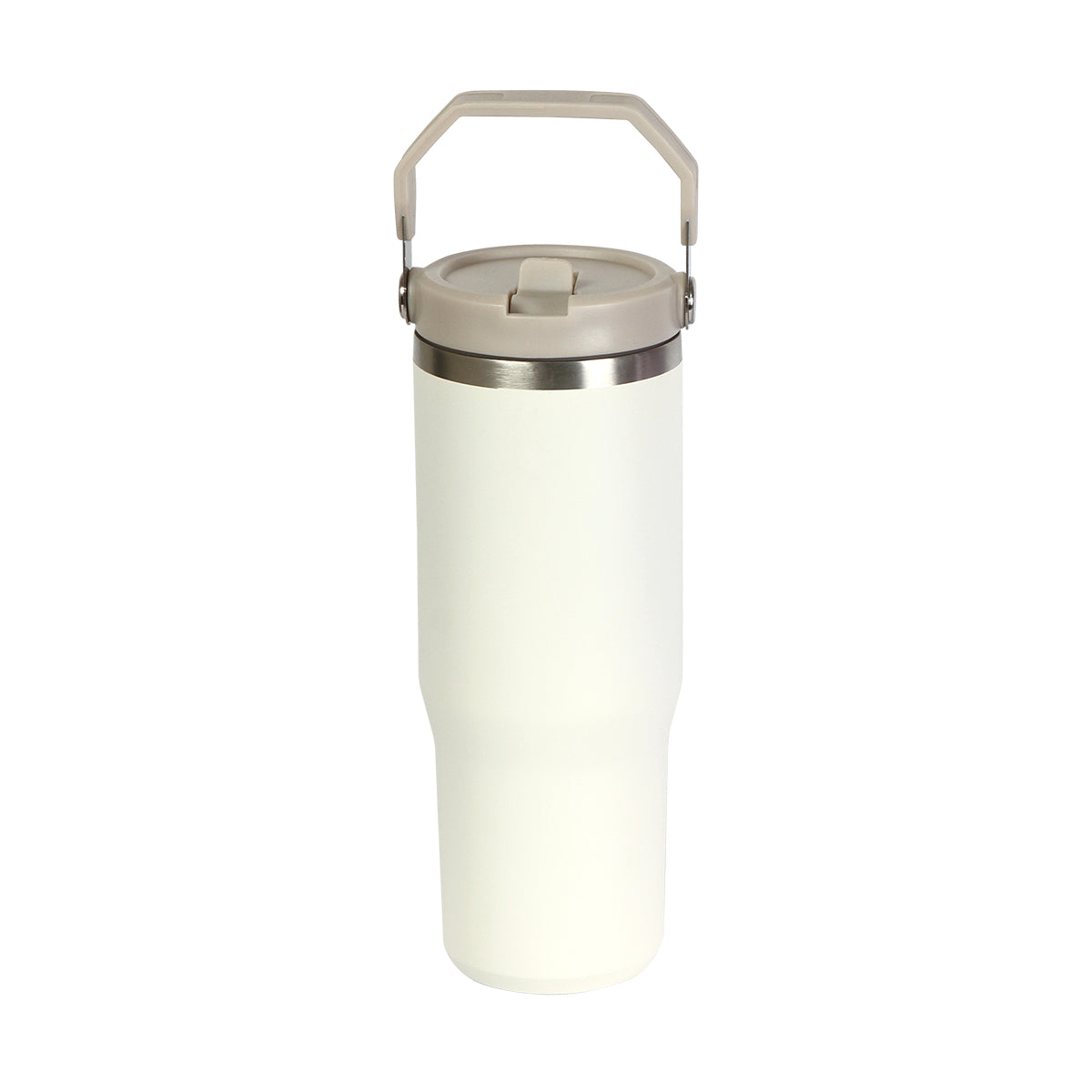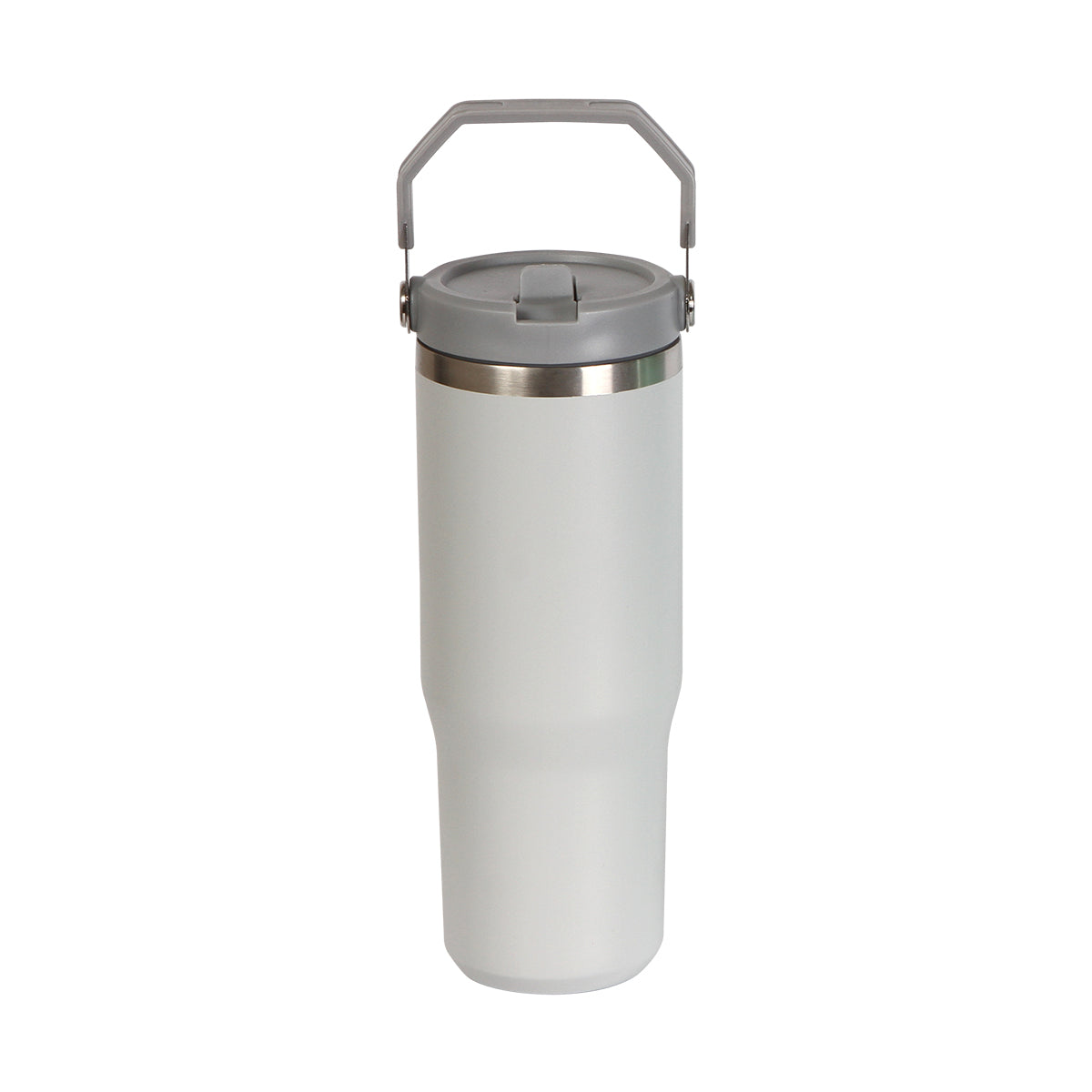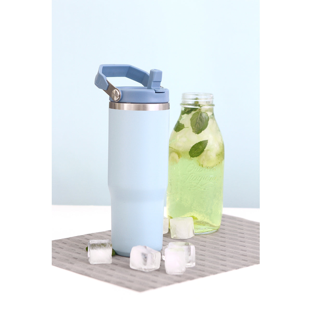 Termo de acero inoxidable de doble pared con tapa de rosca plástica, popote y asa. El popote puede contraerse lo que ayuda a mantener seguro el líquido de la botella. El asa ergonómica es ideal para llevarlo a todas partes.  Capacidad de 900 ml. Incluye caja de cartón individual. No usar en microondas.