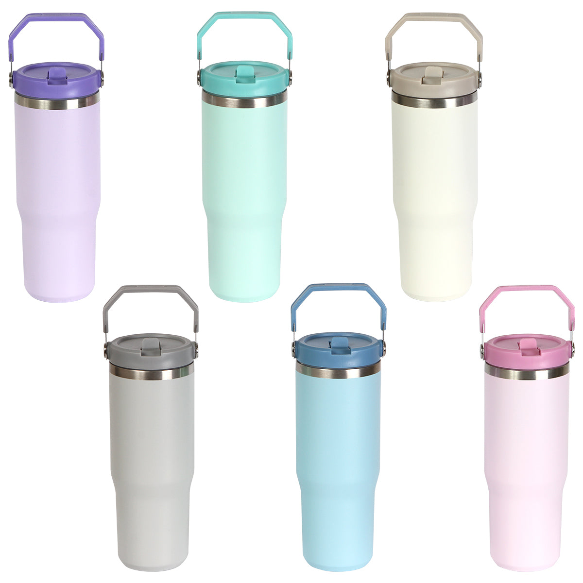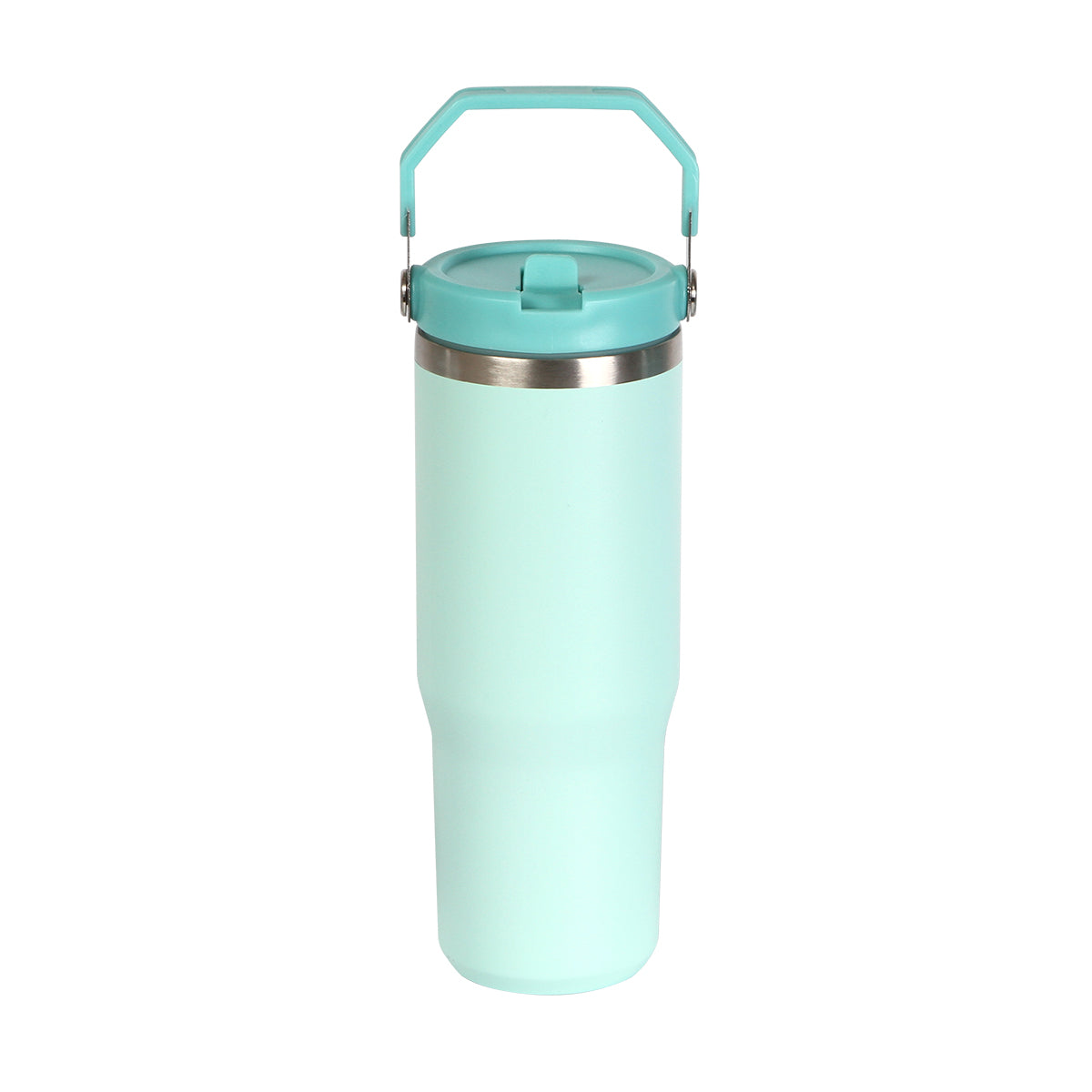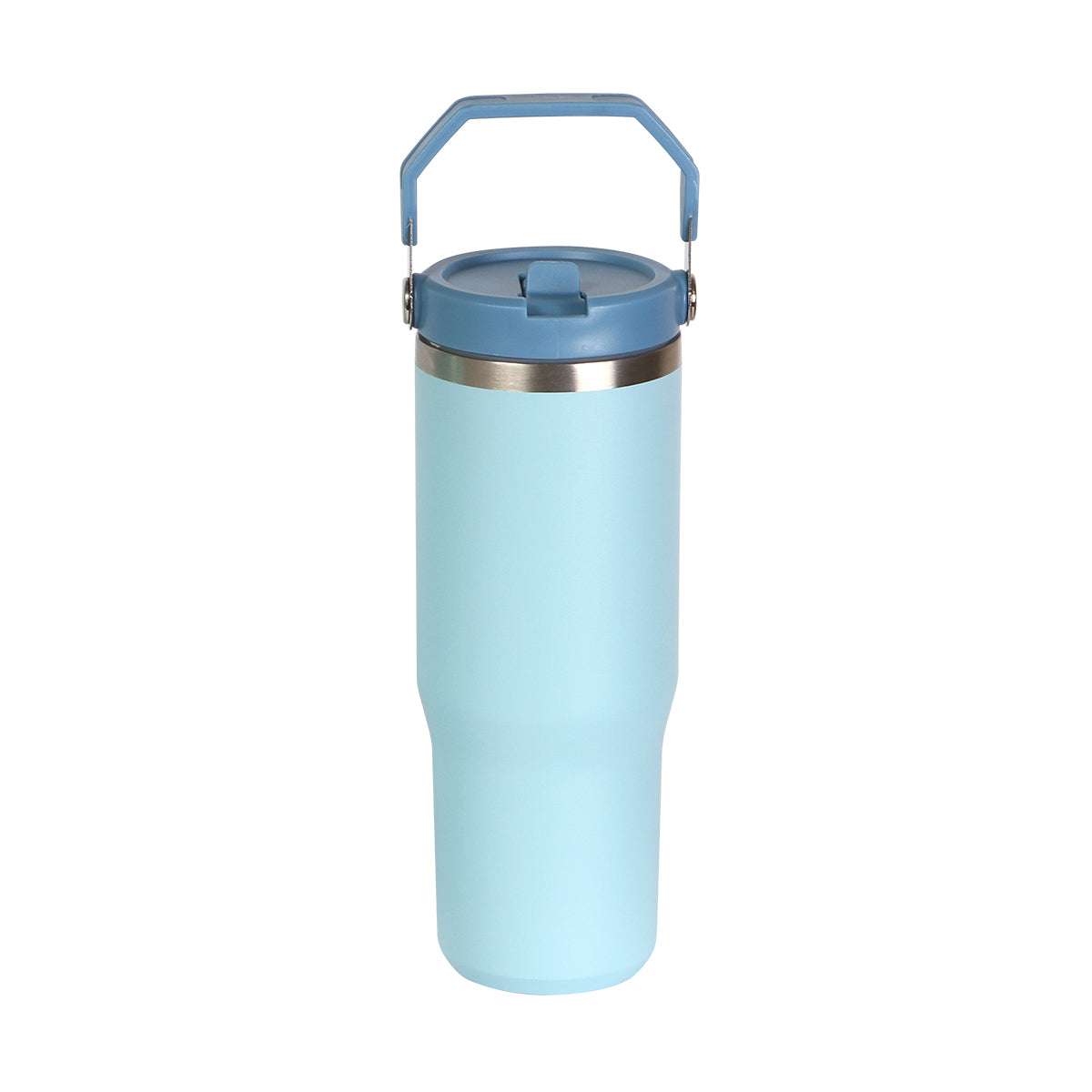 Termo de acero inoxidable de doble pared con tapa de rosca plástica, popote y asa. El popote puede contraerse lo que ayuda a mantener seguro el líquido de la botella. El asa ergonómica es ideal para llevarlo a todas partes.  Capacidad de 900 ml. Incluye caja de cartón individual. No usar en microondas.
