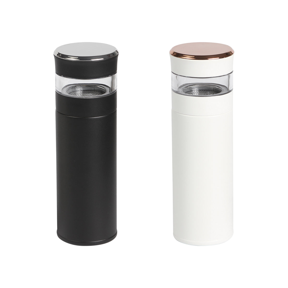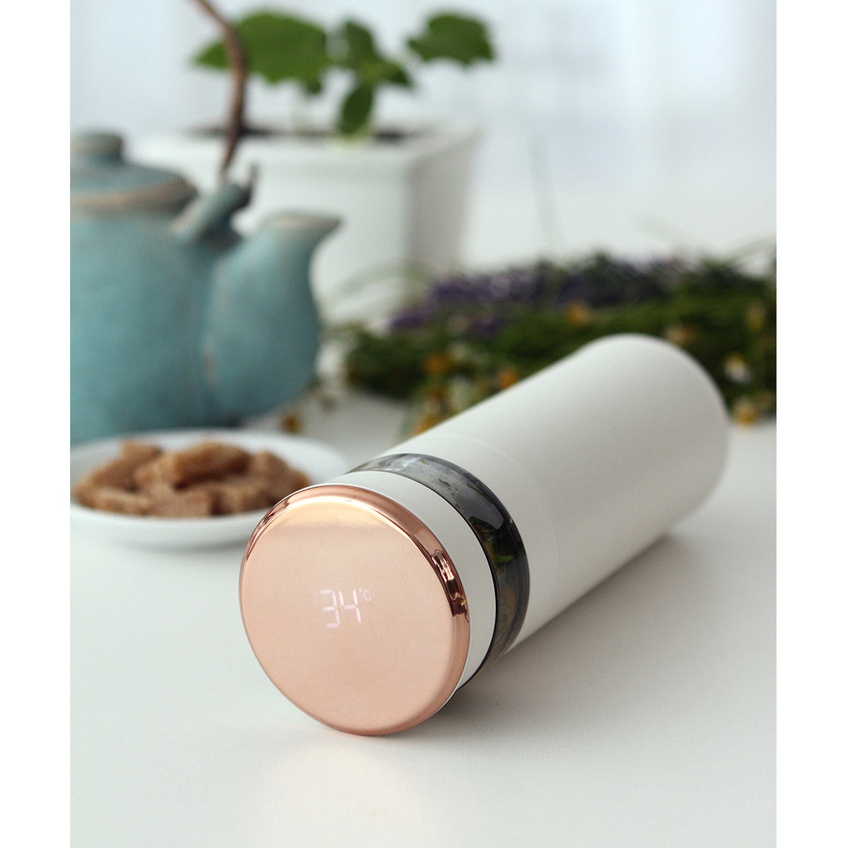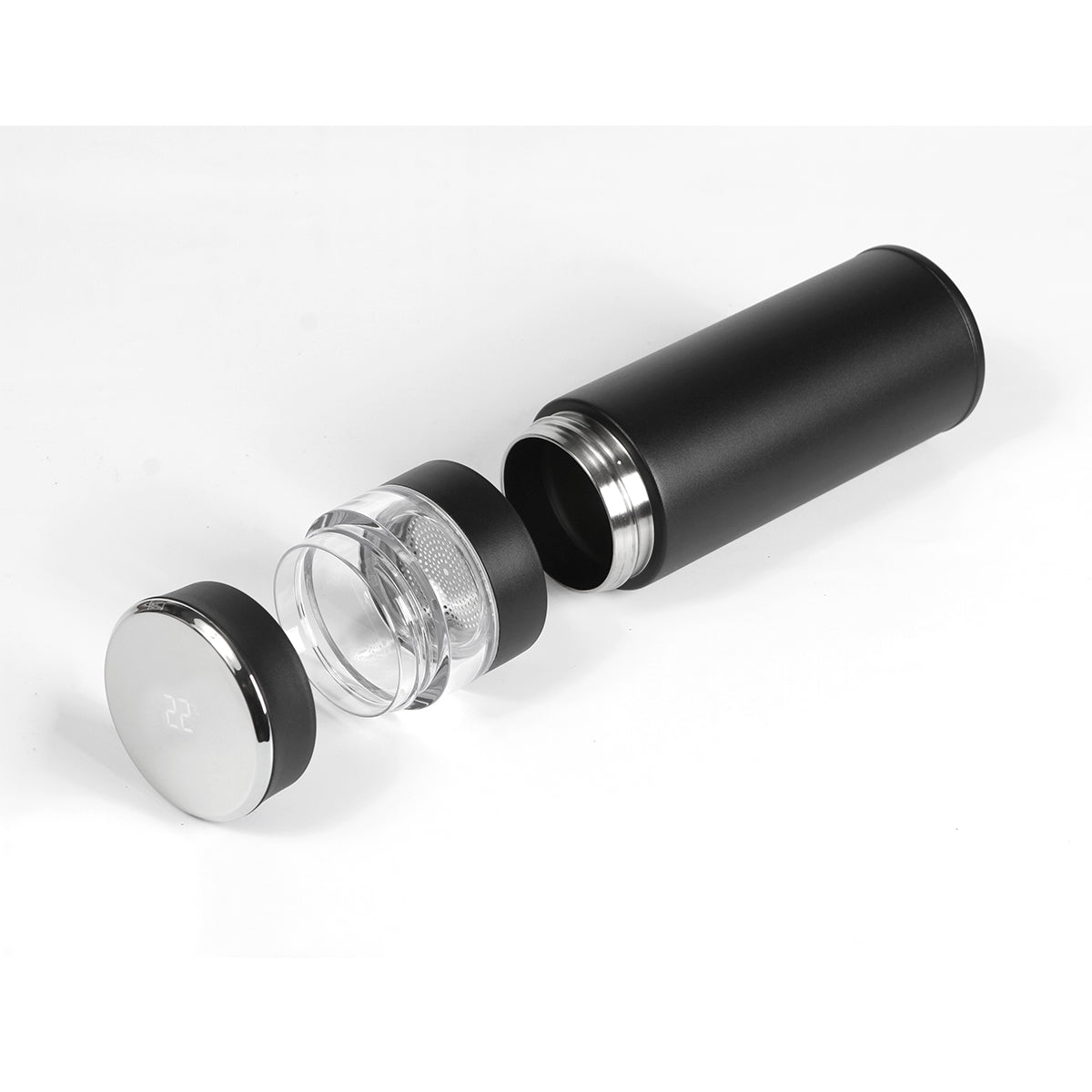 Termo de acero inoxidable doble pared con display de temperatura en la tapa, sección para infusiones con rejilla coladora, fabricada en materiales de grado alimenticio, mantiene bebidas frías o calientes por un largo tiempo. No usar en microondas. Capacidad de 400 ml. Incluye caja de cartón individual.