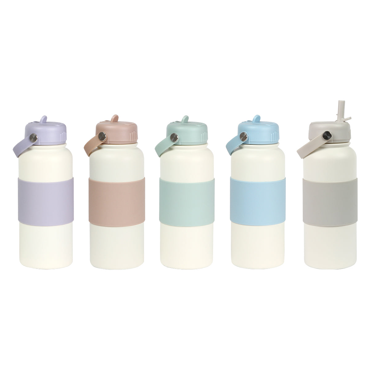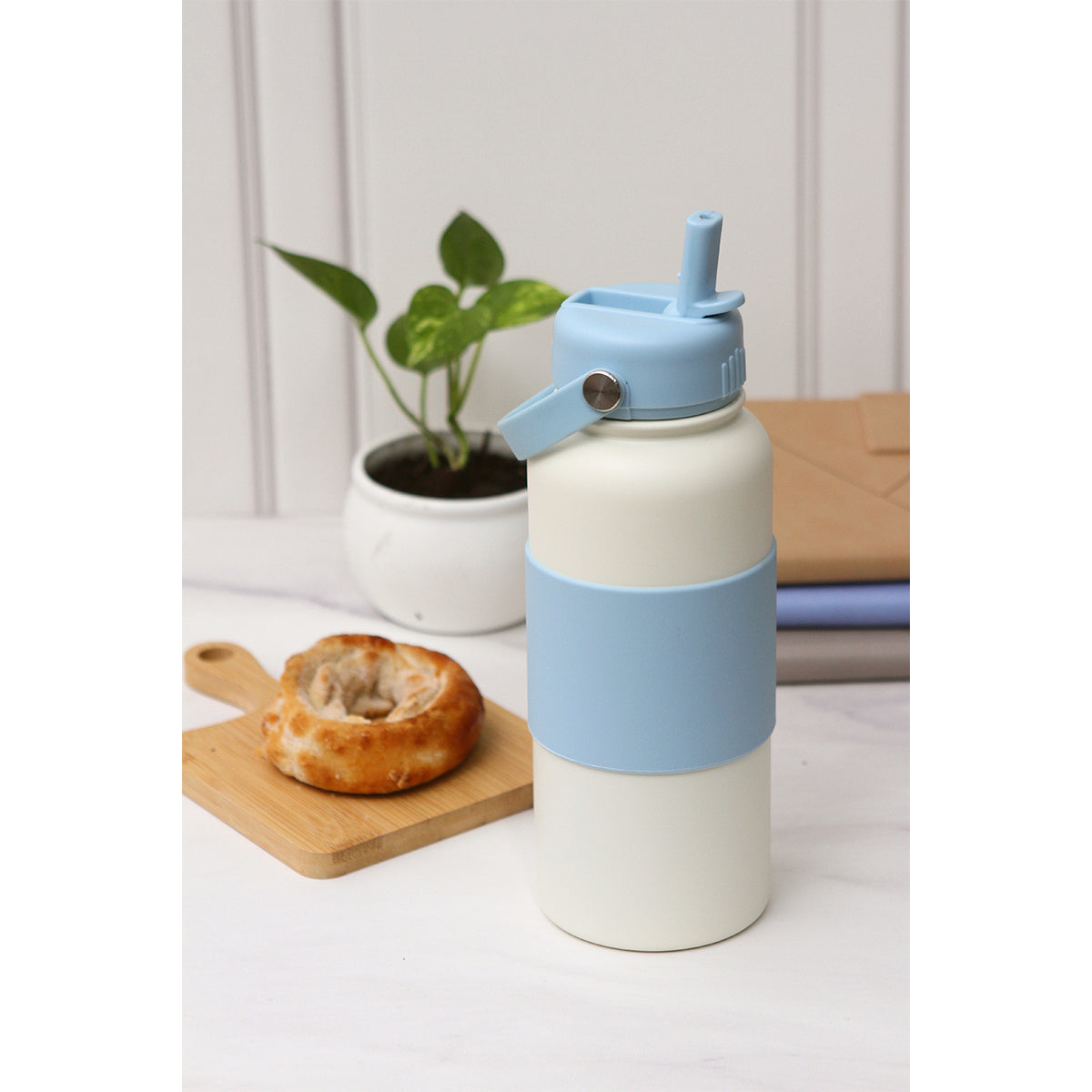 Termo de doble pared fabricado en acero inoxidable, con detalles coloridos. Manga de silicón para una mejor manipulación y evitar que se deslice. Incluye una tapa de polipropileno con agarradera fabricada en TPR. Capacidad de 1,000 ml.